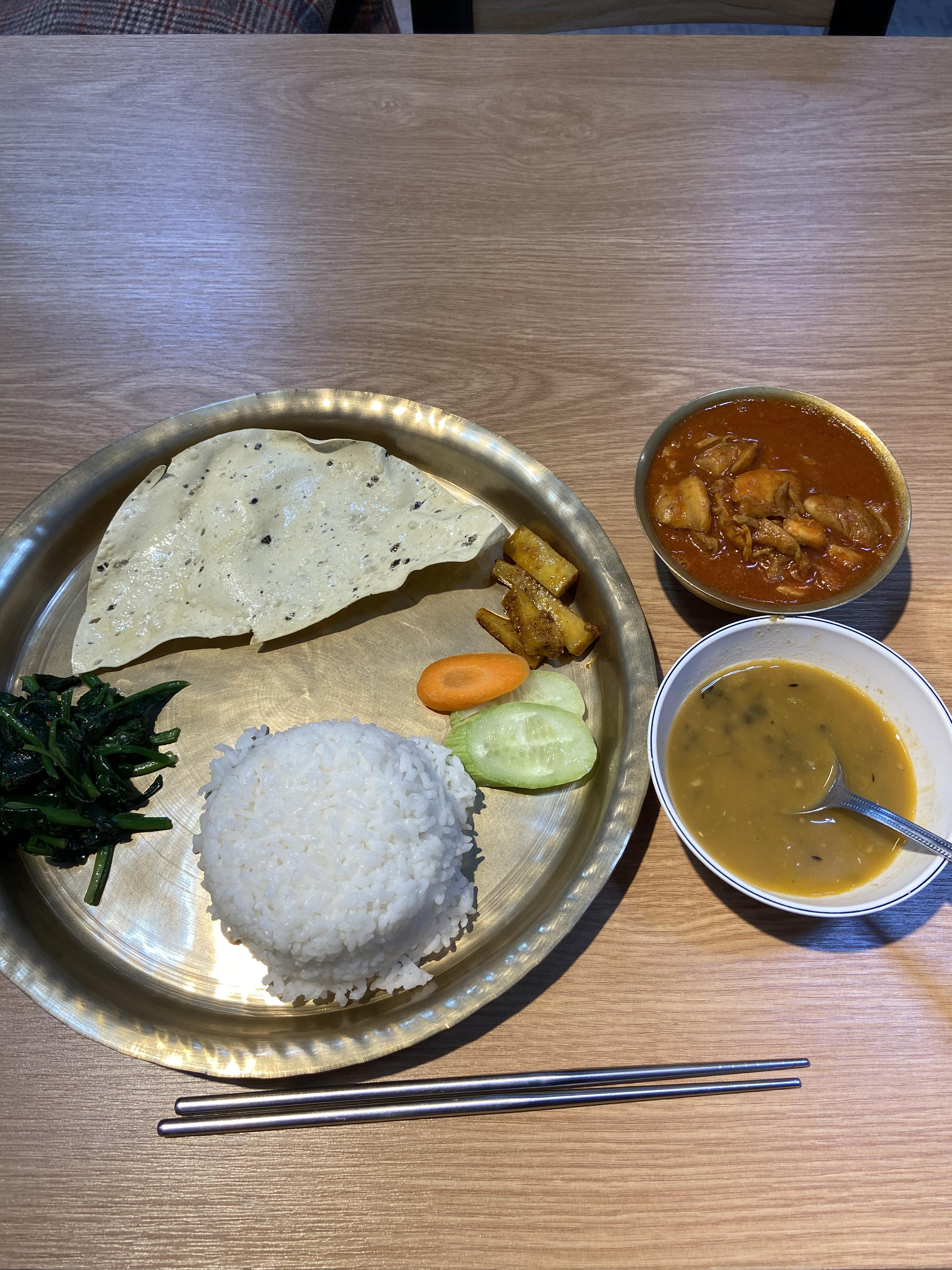 그는 한국에 오기 전 유럽에서 4년 정도 요리를 배웠다. 요리 하는 건 재밌다. 평상시엔 홀에 앉아 친구들과 수다 떨다가도 음식 주문이 들어오면 손을 씻고 모자를 눌러 쓴다. 한국인 대부분은 치킨 난 커리를 시킨다. 탄두리 치킨도 잘 나간다. 한국 사람이 많이 찾는 만큼 이 두 음식은 한국식으로 조리법을 바꿨다. 네팔에서 온 고향 사람은 달리 세트를 시킨다. 이 메뉴만큼은 고향 요리 방식 그대로 만든다. 달리는 쟁반이란 뜻이다. 놋 쟁반 가운데 밥을 놓고 그 주위에 콩가루로 만든 얇은 난 같이 생긴 ‘파파드’, 시금치류를 향신료와 볶은 ‘싸그’ 그리고 네팔 김치인 ‘어짜르’를 둘러 놓는다. 카레와 ‘달’이라 부르는 콩 수프도 함께 나온다. 바로 내가 맛있게 먹은 콩 수프다. 가게 안엔 작은 세면대가 있다. 네팔 사람들은 가게에 들어오면 손부터 씻는다. 네팔 사람들이 많이 온다. 대전 근교에서도 찾아온다. 대전 근교에 아직 네팔 식당이 없는 곳이 많다. 타국에서 장사하는 게 쉽진 않다. 그래도 찾아오는 손님이 있으니 계속한다.