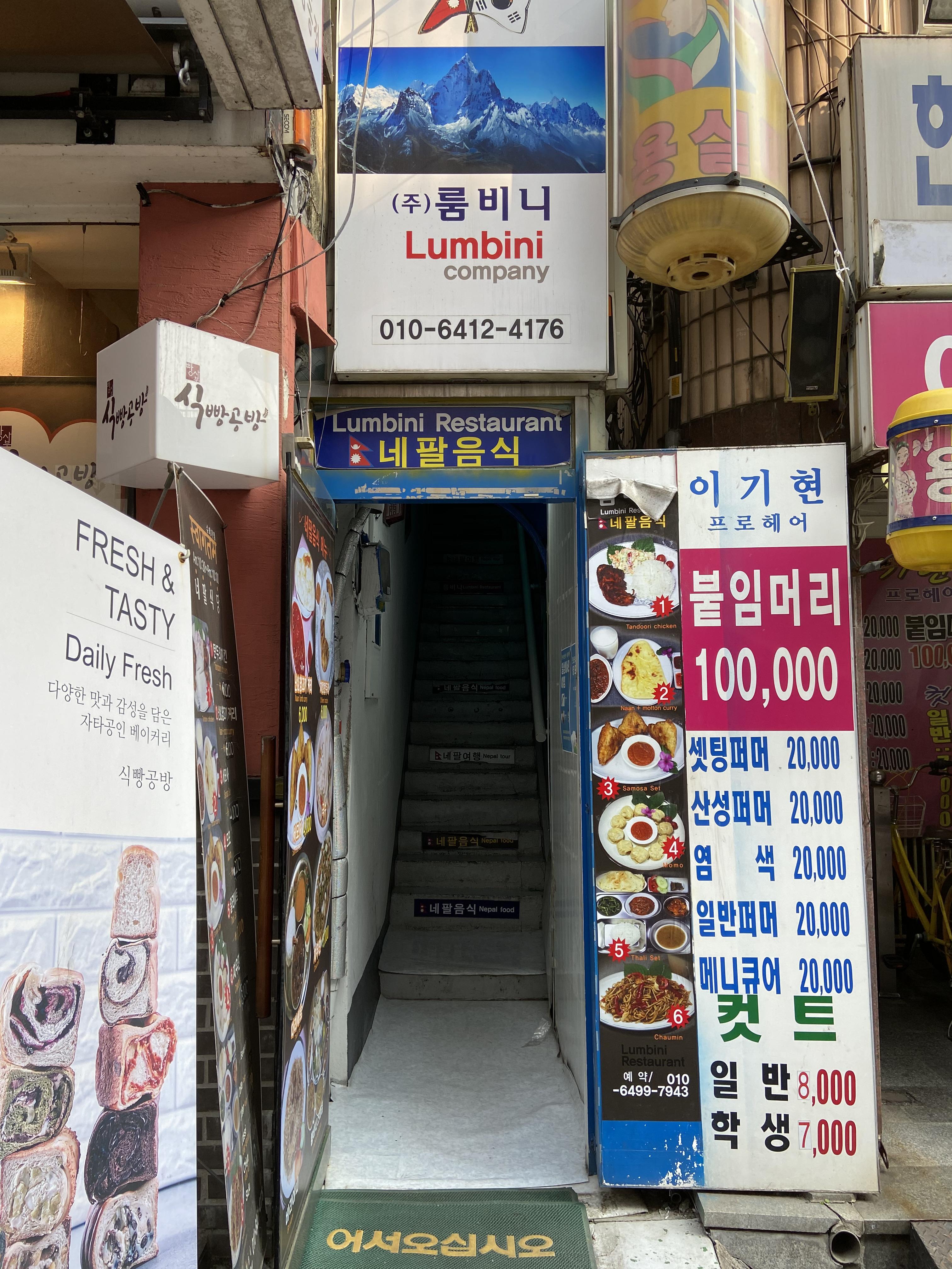 어떻게 시작하면 좋을지 몰라 천천히 밥을 먹었다. 흘깃 옆 테이블을 보니 아까 주인아저씨와 대화를 나누던 사내는 손으로 카레를 비벼 먹는다. 나보다 조금 늦게 들어 온 외국인 세 명은 밥을 기다리는 동안 유튜브로 낯선 노래를 틀었다. 아마 고향 땅에서 듣던 음악인 듯하다. 가게 안엔 한국어가 써 있지만 내게 들리는 소리는 알 수 없는 말뿐이다. 나는 그저 그 말이 네팔어겠구나 추측한다. 가게 문엔 룸비니란 가게 이름과 함께 ‘슈와거떰’이라 적혀있다. 슈와거떰은 네팔어로 ‘어서 오세요’란 뜻이다. 은행동 골목에 위치한 룸비니는 2층에 있다. 좁은 계단을 지나야 만날 수 있는 곳. 익숙한 건물 사이에 작은 틈이 있다. 그 틈을 지나면 펼쳐지는 낯선 세상. 미리 준비한 인터뷰 질문이 어리석었다 생각하며 카레를 떠먹는다. 역시 어떤 질문을 할지 고민할 게 아니라 어떻게 하면 더 쉬운 말로 질문할지 고민하는 게 나았으려나. 아니면 혹시 모르니까 영어로도 준비하는게 나았을지도.