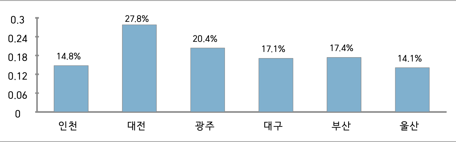 <6개 광역시 별 1인 가구 비율 중, ‘20~29세’가 차지하는 비율(출처: 통계청, 「2020 지역별 고용조사」) >