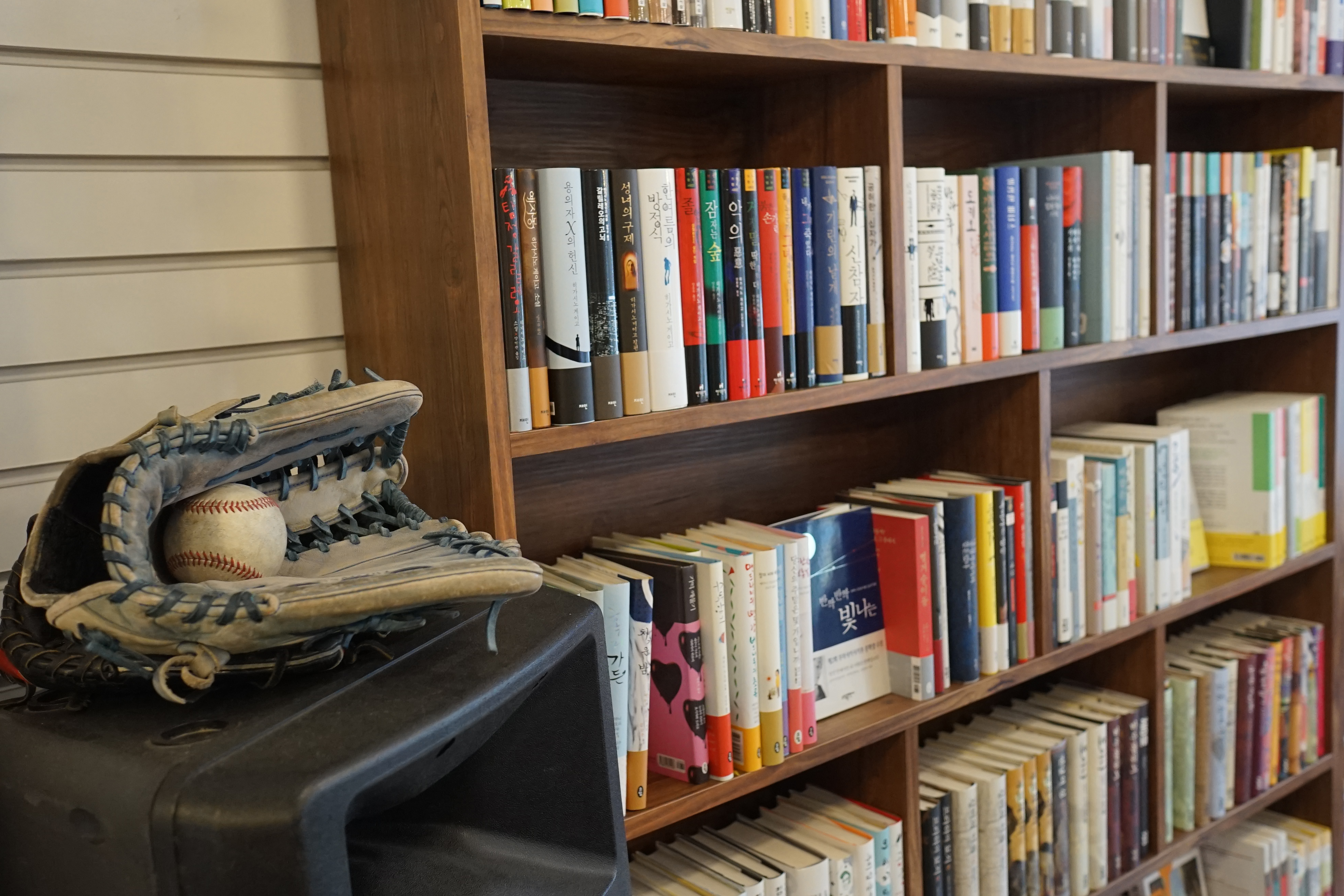 책방에 들어서면 입구 양 옆으로 책장이 나란히 있다. 책장에 알록달록 꽂힌 책을 보는 것은 수많은 점들로 이뤄진 모자이크를 보는 것 같다. 통기타가 책방 한 구석에 있고 작은 앰프가 있다. 캐치볼 할 때 쓴 야구 글러브가 있고 농구공이 의자 밑에 뒹굴 거린다. 작은 주방엔 커피머신이 있고 주전자와 냄비가 있으며 한 구석엔 라면 봉지가 빨갛게 보인다. 부쩍 추워진 탓에 가게에 들어와 잠시 몸을 비빌 때, 책방 앞 공방 사장님이 아메리카노 두 잔을 주문하고 나간다. 혹시 이곳은 커피 맛집일까? 대표는 커피도 좋지만 요즘은 겨울이 다가온 만큼 책방에선 핫 초코가 인기라고 한다. 초콜렛을 녹이고 우유를 데운 후 초코 파우더를 넣어 잘 저어준다. 마지막에 마시멜로우를 불에 살짝 구워 잔 위에 띄운다. 그리 크지 않은 공간이라 대표가 음료를 만드는 동안 적당한 거리를 두고 원두를 부수거나 초콜렛 녹이는 과정을 볼 수 있다. 그 적당한 거리감 속에 앉아 커피를 기다리는 순간은 마치 산 속 대피소에서 만난 산장 주인의 위로 같다. 날씨가 추워서, 신성동이 내겐 먼 동네라 더 그런 느낌을 주었는지도 모르겠다.