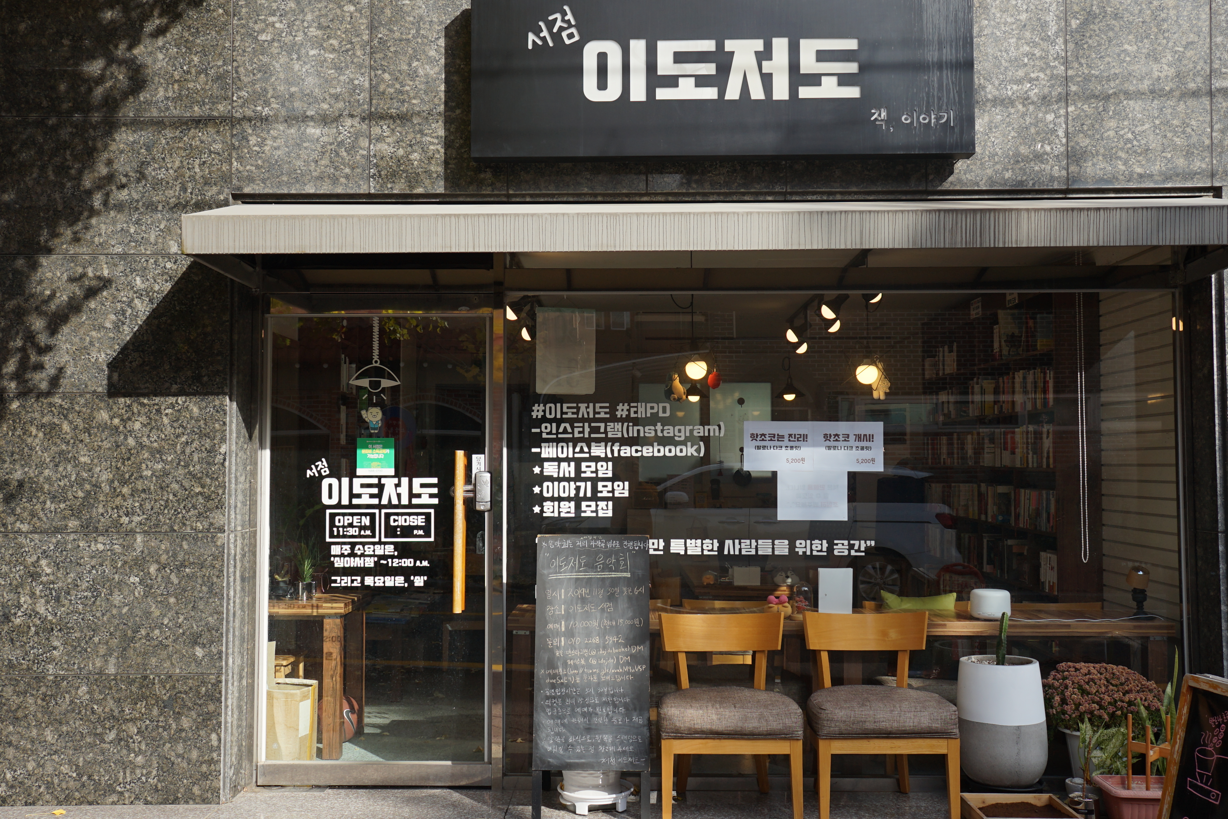 책방은 목요일에 문을 닫는다. 보통은 주말이나 월요일에 문을 닫는데 목요일이라니. 별 뜻은 없었다고 한다. 남들 다 쉬는 주말에 쉬고 싶지 않아 고민하다 목요일에 쉬기로 했다. 가끔은 목요일에 책방에 왔다 돌아가는 손님 이야기를 듣기도 한다. 이제와 다시 쉬는 날을 바꾸자니 그것도 기존 손님에게 피해가는 것 같아 이도저도 못한 채 계속 목요일에 쉰다. 17년 10월에 처음 책방을 오픈했다. 태병건 대표가 작년 여름부터 만든 자작곡으로 음악회를 연다. 이것을 해도 좋고 저것을 해도 좋다. 책을 읽거나 차를 마시거나 가끔은 캐치볼도 좋다. 꼭 무엇이 될 필요는 없기에 이도저도다.
