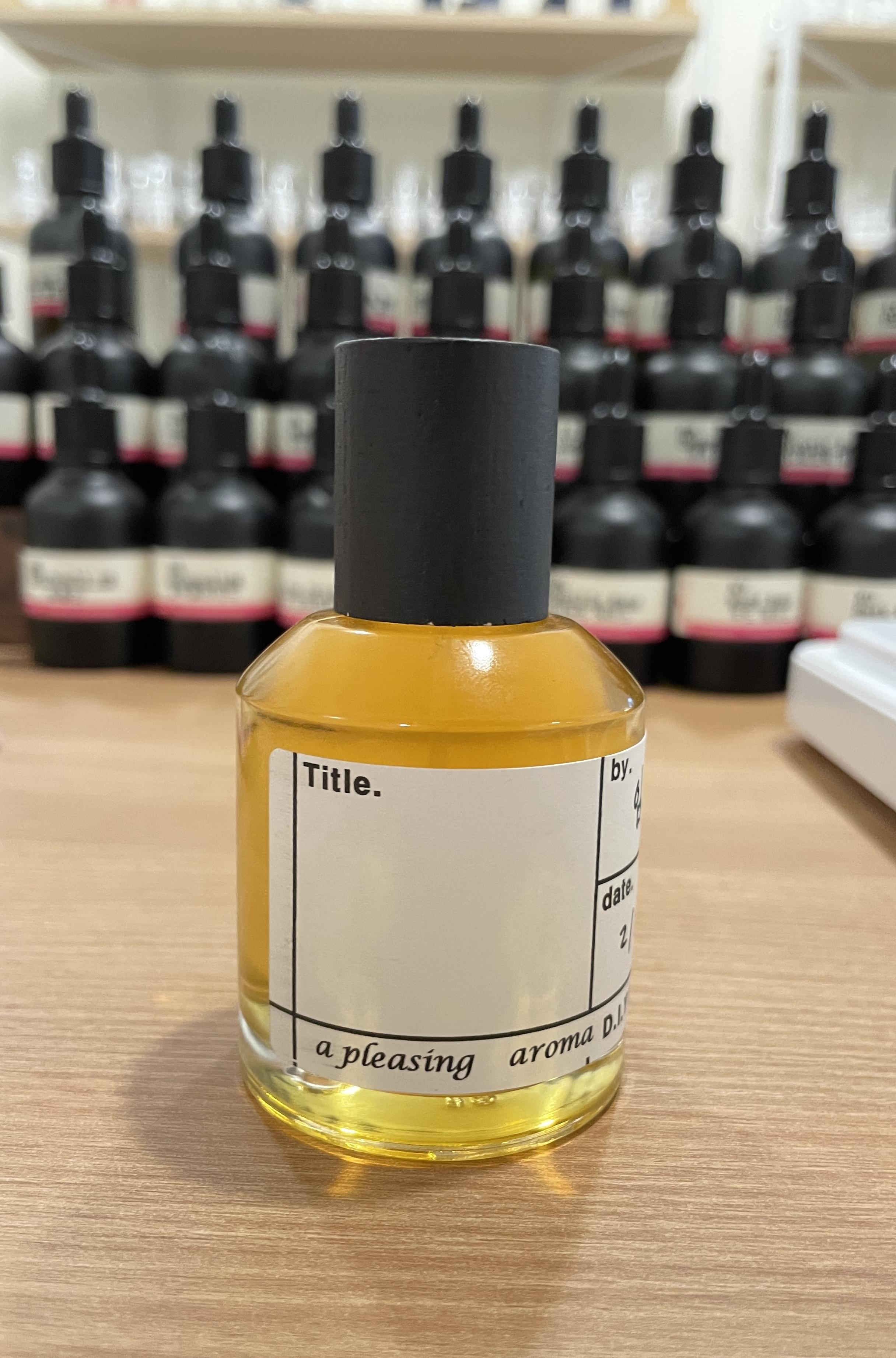 향수를 만드는 과정은 서른다섯 가지의 향을 맡으며 미리 준비해 둔 종이에 각각의 향을 자신이 느낀 그대로 어떤 표현이든 관계없이 모두 적으며 맘에 드는 향을 따로 빼놓는다. 나는 ‘페놀’이라는 향이 마음에 들었다. 페놀은 사실 악취로 분류되나 중독 때문에 사용한다고 한다. 난 소독약 같은 알코올 향과 훈연향이 느껴졌다. 지용 씨는 나에게 “확실히 대중적인 취향은 아닌 거 같네요(웃음)”라고 했다. 이후 선택한 향들을 천천히 시간을 두고 최종 결정을 한다. 향수에는 탑노트, 미들노트, 베이스노트가 있다. 간단하게 설명하자면 향이 나는 순서이다. 탑노트는 향수를 뿌리고 알코올이 날아간 약 10분 전후의 향이다. 주로 레몬이나 오렌지처럼 휘발성이 강한 향을 사용한다. 미들노트는 탑노트 이후 나는 향수의 이미지를 결정하는 핵심적인 향이다 하트노트라고도 불린다. 마지막으로 베이스노트는 우리가 흔히 잔향이라고 표현하는 바로 그 향기이다. 향의 특성에 따라 각 노트별로 향료들이 나뉘어있다. 향수를 만드는데 노트별로 향료를 넣는 비율을 다르게 해야 한다고 한다. 김지용 씨는 노트 별 비율를 결정해준다. 이후 노트별로 결정된 비율 안에서 자유롭게 향료들의 비율을 결정해 섞고 지용 씨와 함께 시향을 하면서 향을 원하는 방향으로 다듬어 나간다. 나는 단순히 우디한 향(따뜻한 느낌의 나무 같은 향)이 더 부각됐으면 해서 ‘우드 베이스’의 향료를 더 넣는 게 좋을 거라 생각했다. 하지만 단순히 그 향을 추가하는 것은 효과적이지 못했다. 조향사님은 나무와는 전혀 관련 없어 보이는 ‘파우더리 베이스’ 향료를 추천하며 “오히려 이 향료를 넣는 게 우디한 느낌을 증폭시키는데 효과적일 거예요.”라며 가이드 역할을 해줬다. 신기하게도 추천받은 향료를 넣으니 거짓말처럼 향이 원하는 방향으로 흘러갔다. 정말 신기했고 역시 조향은 아무나 하는 게 아니구나라는 생각이 들었다. 여러 시행착오를 거치며 마침내 완성된 향을 대부분이 알코올로 이루어진 향수 베이스에 섞으며 병에 담으며 향수 체험은 마무리된다.