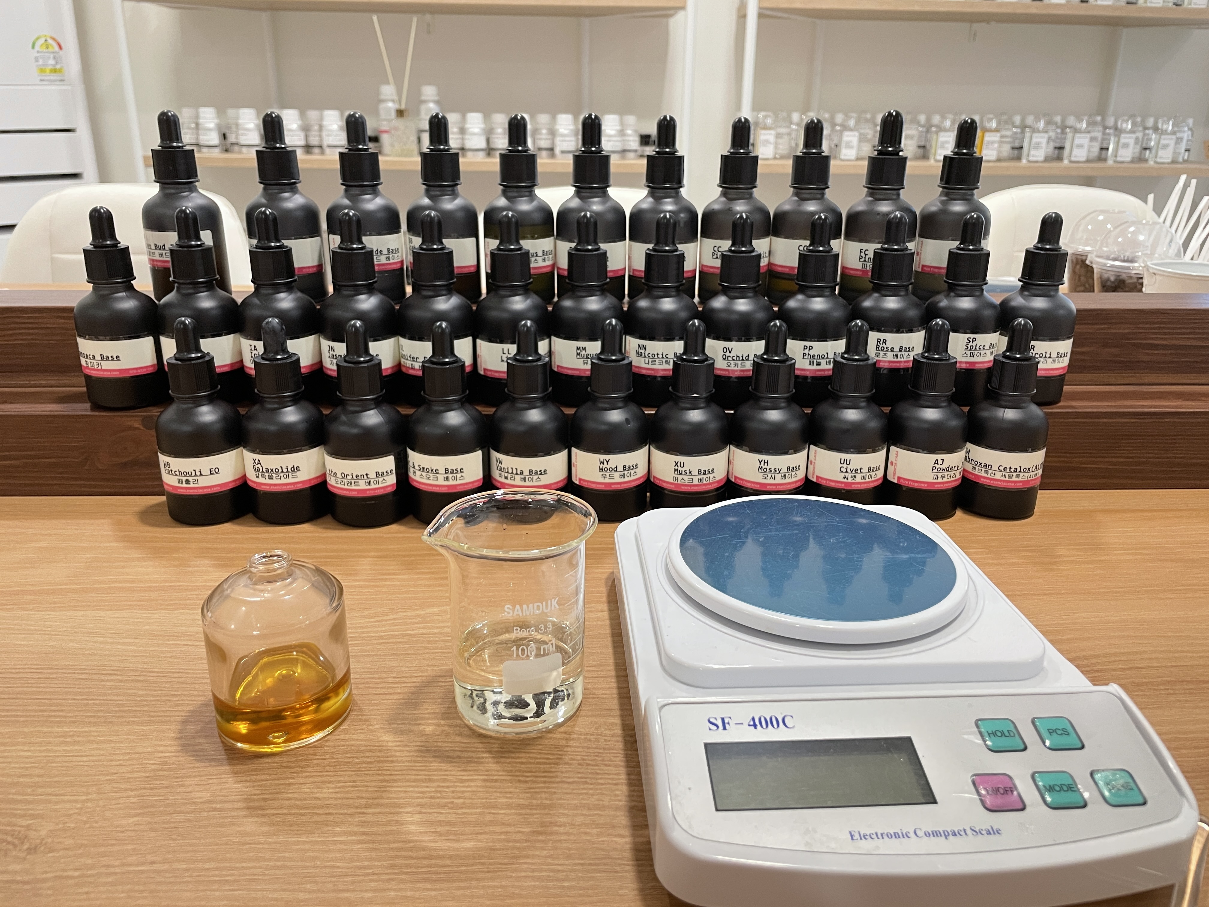 “커스텀 향수는 나만의 향수도 아니고 조향사가 만들어 놓은 향에 덮어씌우는 거 밖에 안된다고 생각해요. 저희 조향 공방 같은 경우는 앞에 보이시는 35가지의 향료를 다 맡아보고 앞에 있는 비커에 맘에 드는 향을 골라 원하는 만큼 골라 섞어 향을 만드는 거예요. 본인들이 원하는 자신만의 향을 만드는 거죠”