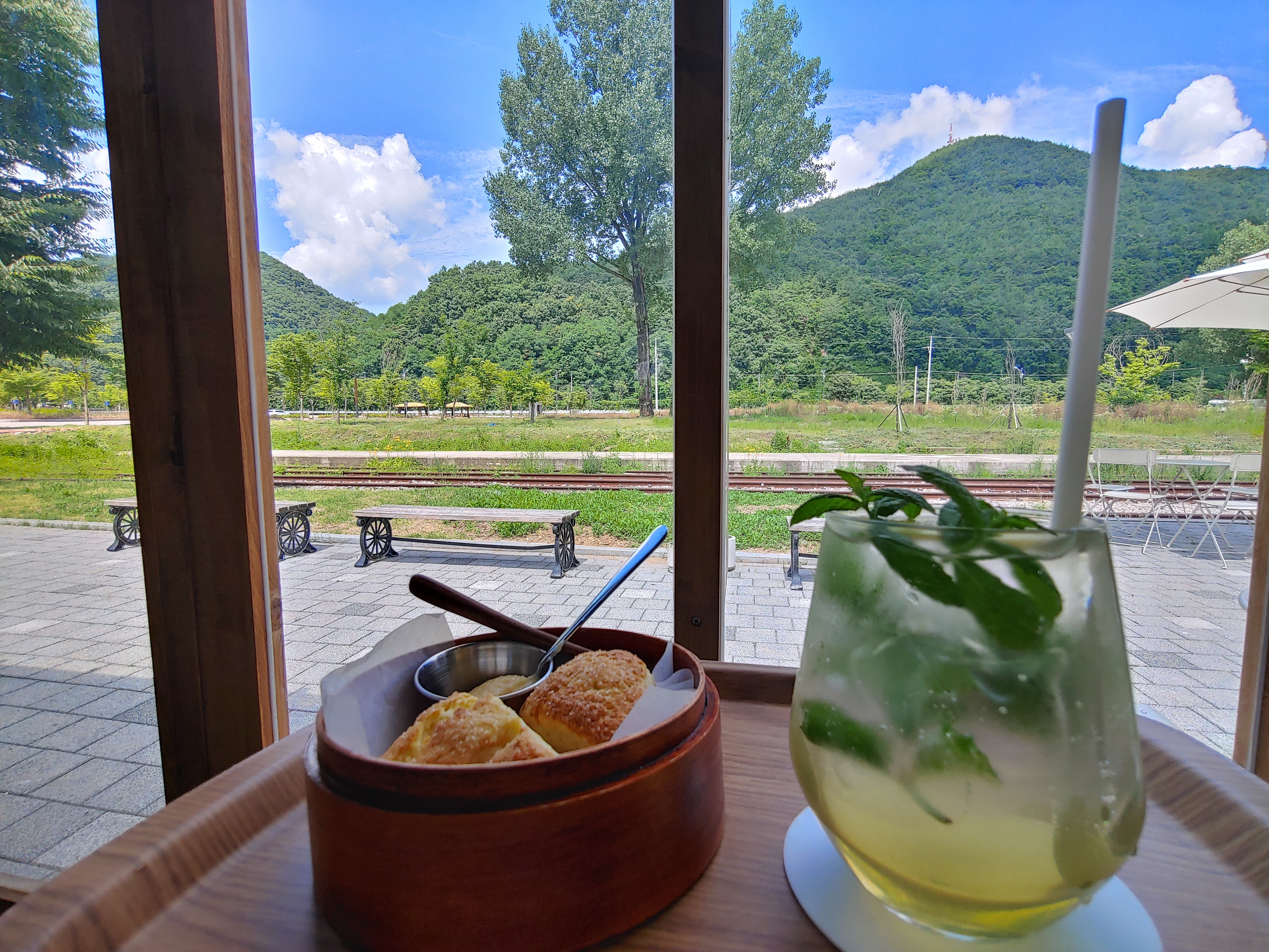 카페 가은역은 문경의 지역 특산물 중 하나인 사과를 활용하여 사과 밀크티, 사과 모히또, 사과 라떼, 사과차, 사과버터 등을 판매한다. 여기에 디저트로는 ‘마들렌 도시락’, ‘스콘 도시락 with 사과버터’, ‘사과 쿠키’가 있다. 점심시간 이후에 방문했더니 밀크티는 품절인지라, 사과모히또와 스콘 도시락을 시켰다. 혼자서는 카페에 가지 않는 나의 가치관을 훼손시킬 만한 맛과 풍경을 준 카페 가은역에 고마울 따름이다.
