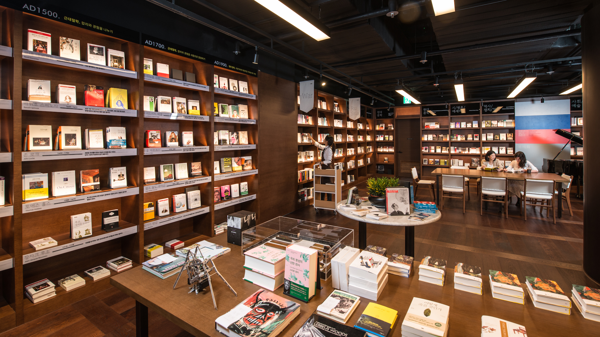‘예술의 시대’, ‘칼 세이건’, ‘1988’이란 테마가 붙은 서가에서 보여 주는 주제에 따른 다양한 도서의 모음들과 연대기별 정리는 전시실에 온 듯한 기분을 준다. 가령 예술의 시대 한쪽에 모아 둔 수전 손택의 저서를 바라보고 있노라면, 그중에 한 권은 꼭 읽고 싶다는 기분이 든다. 그리고 ‘작가들의 선택’ 서가가 소개하는 명사들이 애장하는 도서 앞에서는 마치 개인 서재에 와 있는 것만 같다. 저절로 평소 관심을 두었던 명사가 추천한 책에 손이 간다. 이 모두가 철저히 상업적 계산에서 이루어진 것이라기보다, 누군가에 의해 한 번은 걸러진 선별 도서의 목록이라는 점이 가장 큰 매력이다. 그러니 이곳은 팔려는 욕망보다 발견하려는 욕망이 바탕색으로 깔려 있는 장소인 셈이다.