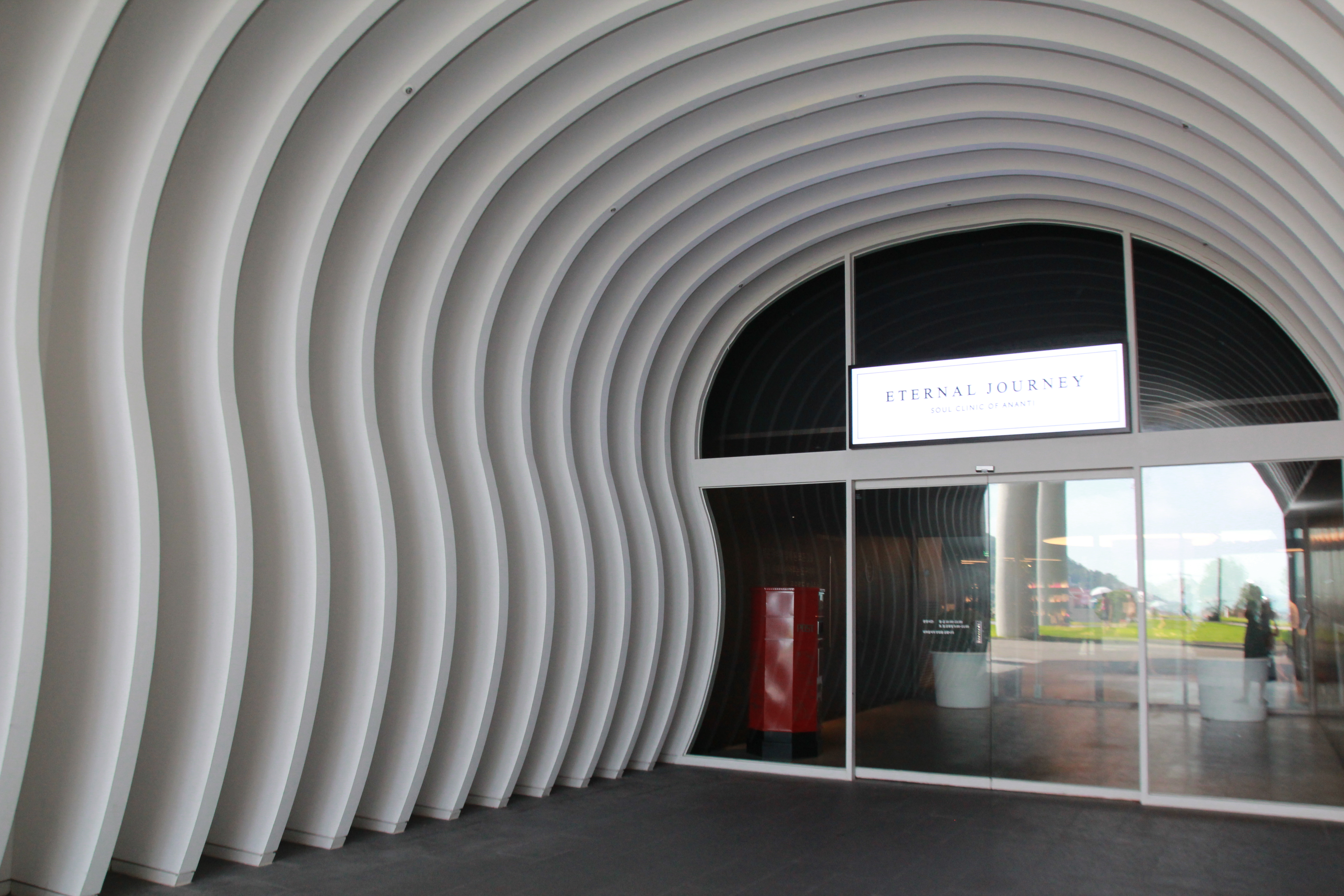 아난티 타운의 건물을 지나 안쪽으로 들어가면 힐튼 부산 지하 2층의 이터널 저니로 들어서는 입구가 보인다. 건물은 동해 바다와 마주하고 있다. 모던한 회색 건물과 푸른빛의 바다가 선명한 대조를 이루며 청량감을 준다.