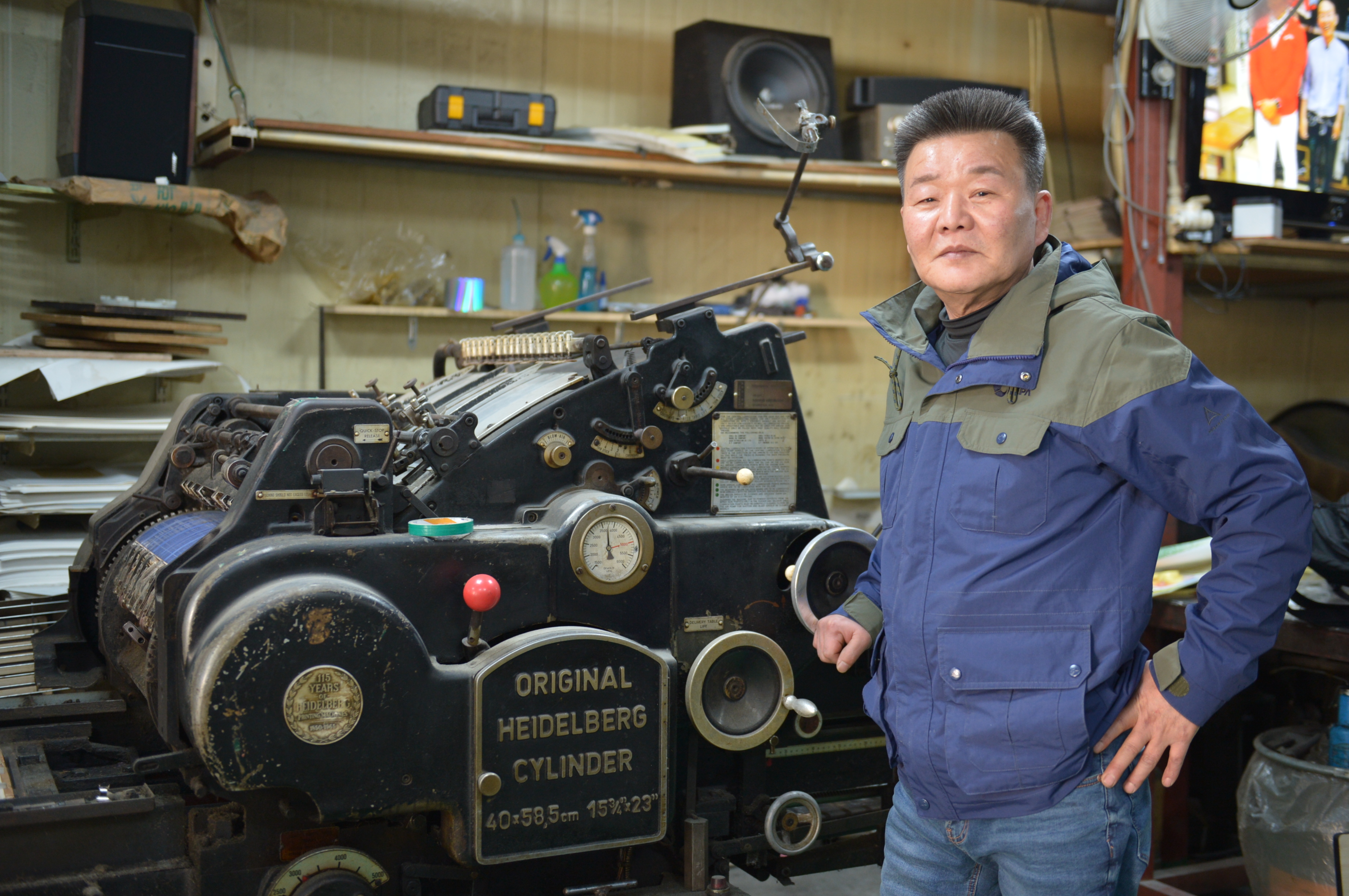 대광지공사의 터줏대감은 아무래도 육중한 몸을 지닌 도무송 기계 세 대일 듯싶다. 1950년대부터 2000년대까지 시대를 달리해 탄생한 기계는 작업물의 종류에 따라 여전히 제 할 일을 해낸다. 공간을 가장 많이 차지하는 기계는 대광지공사에서 가장 나이가 어린 자동화 계기로, 시대의 흐름을 받아들인 전백현 씨가 4년 전에 중고로 사 왔다. 그 옆으로는 독일제 기계와 국산 기계가 한 자리씩 차지하고 있다. 독일제 기계는 영화 <모던타임즈>에서 봤을 법한 형태를 지녔다. ‘오리지널 하이델베르크 실린더’라 적힌 기계는 본래 독일제 활판 인쇄 기계를 도무송 작업이 가능하도록 개조한 제품이다. 과거 전백현 씨가 서울 인쇄 거리를 돌아다니다 이 기계로 스티커 작업을 하는 것을 보고, 전문적인 스티커 작업을 위해 20여 년 전에 들여왔다. 지금은 스티커 작업 의뢰가 잘 들어오지 않아 예전처럼 자주 쓰이지는 않지만, 특수재질 가공 시에 종종 쓰인다.