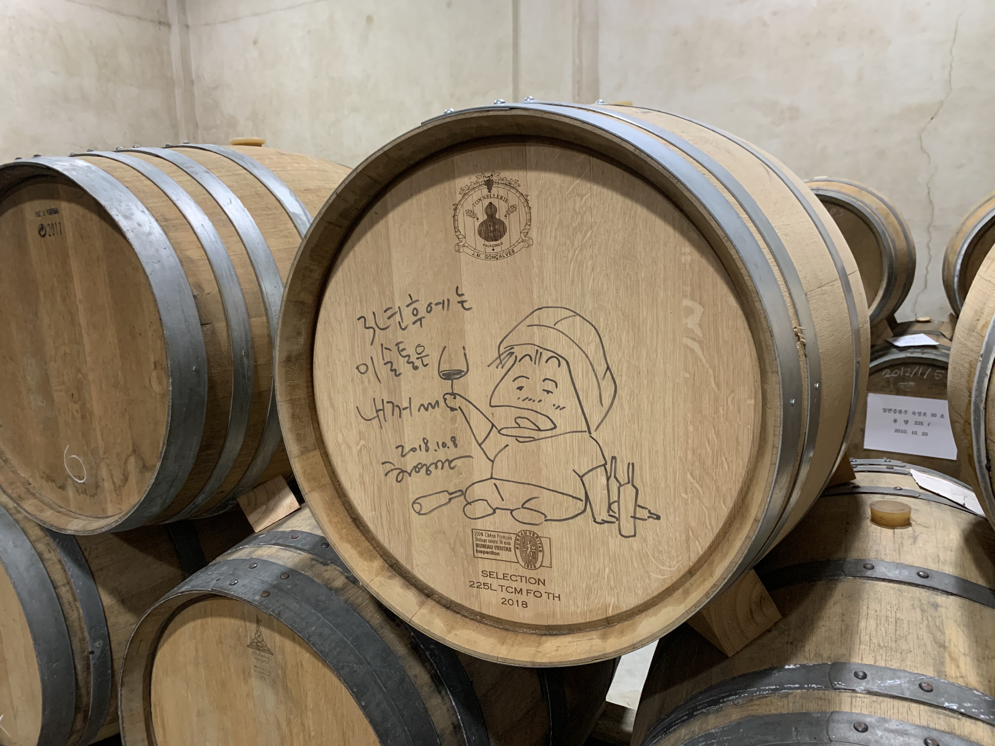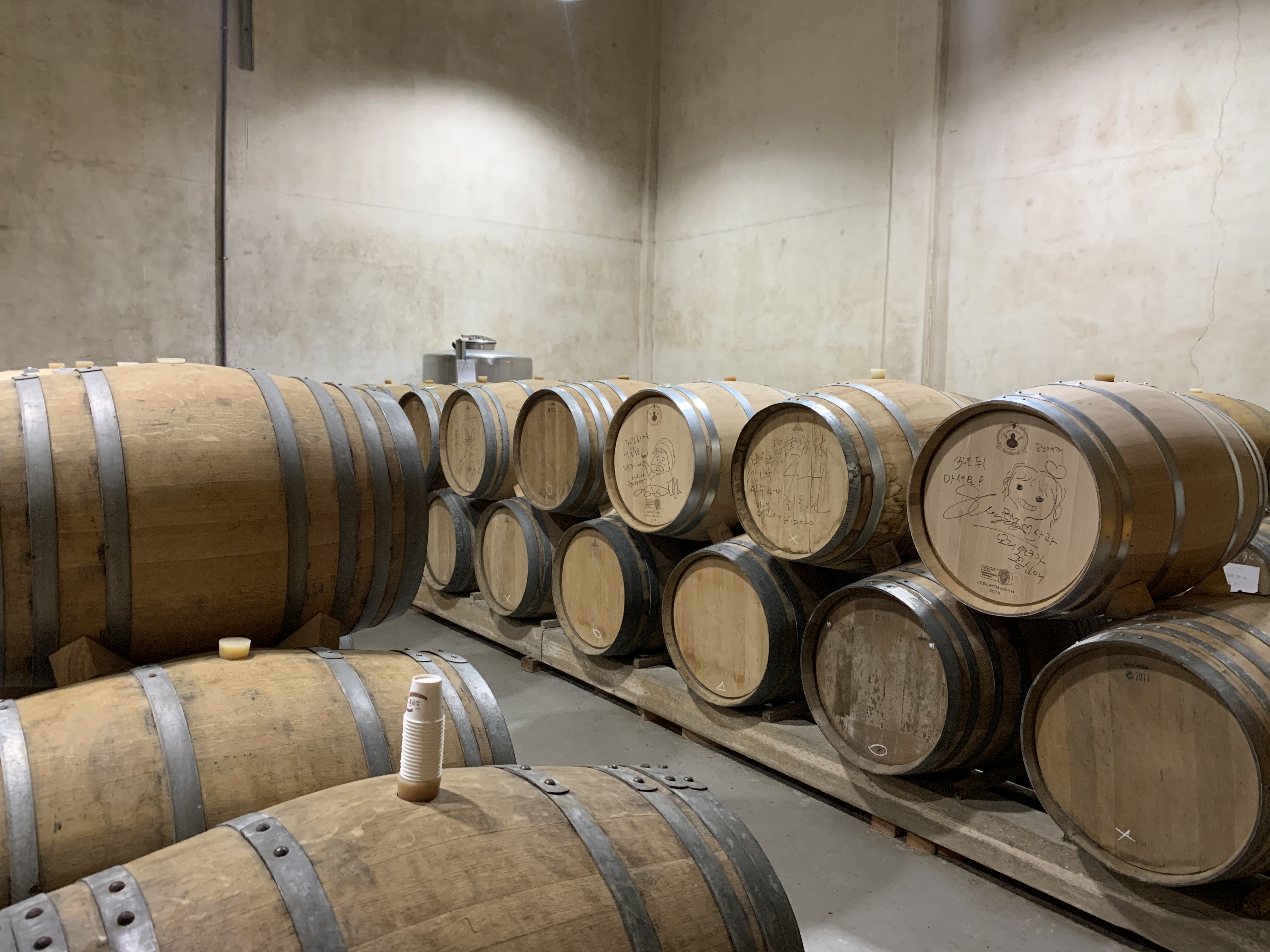 겹겹이 쌓인 참나무통에는 ‘3년 후 개봉’이라는 문구와 함께 다양한 사람이 사인을 했다. 그중 요리연구가 백종원 씨가 함께 제조한 와인의 숙성통도 눈에 띄었다. 2020년 5월에 방송한 SBS 예능프로그램 <맛남의 광장>을 촬영하면서 연구한 술이다. 대전와인 NAKSSIK 숙성통도 ‘2021년 2월 개봉’이라는 문구를 단 채 숙성과정에 있다. 이러면 설 전에 병입이 가능하다.