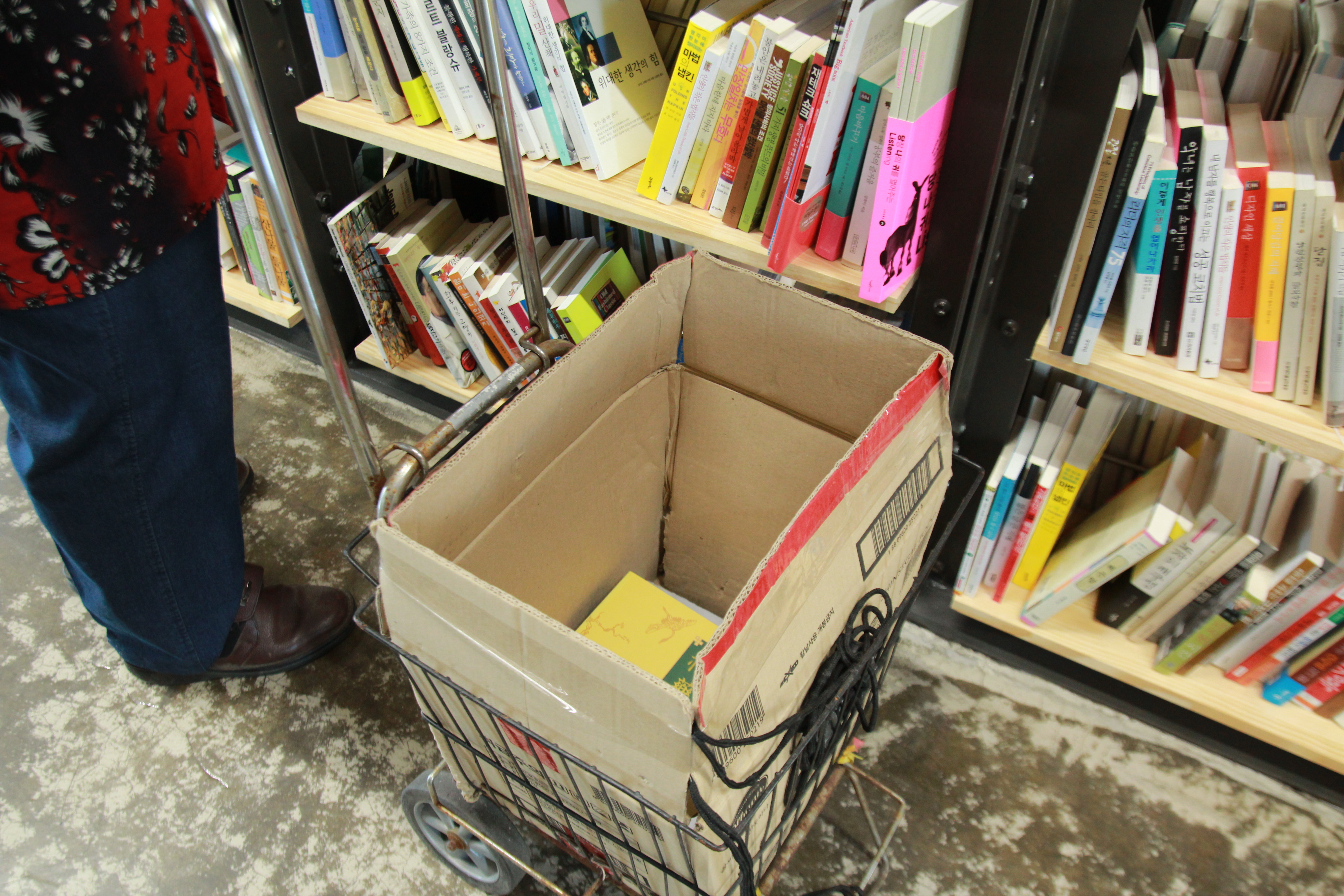 아니라고, 그냥 책 사러 왔다는 할아버지는 작은 수레 위에 얹은 종이박스 속에 책을 쌓고 있었다. 아까 봤을 땐 사다리를 사용해 아주 위쪽의 책을 보고 있었다. 마음으로 확신하고 던진 질문에 경계하며 수줍게 답했다. 궁금한 마음에 자주 오는지 물었다. 미소 지으며 “종종 와요”라고 했다. 동양 의학을 연구하고 있다는 할아버지에게 책 쌓은 수레를 찍어도 되냐고 물었다. 마음에 드는 게 없어 얼마 고르지 못했다며 멋쩍게 웃었다. 이곳 헌책방 책을 전부 훑고 있었다.