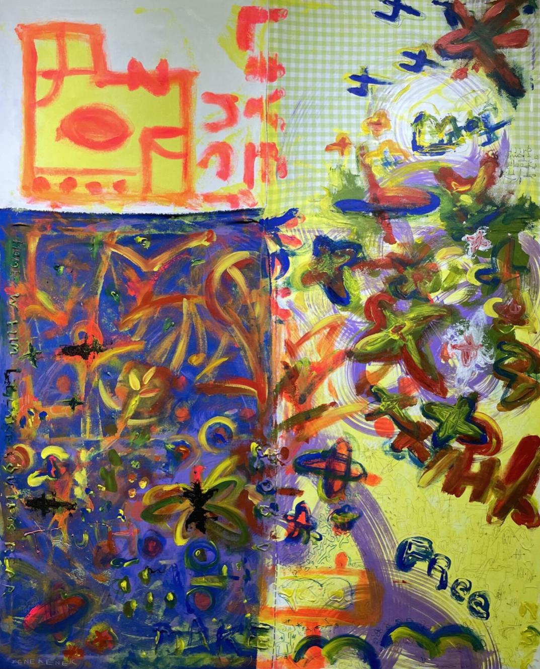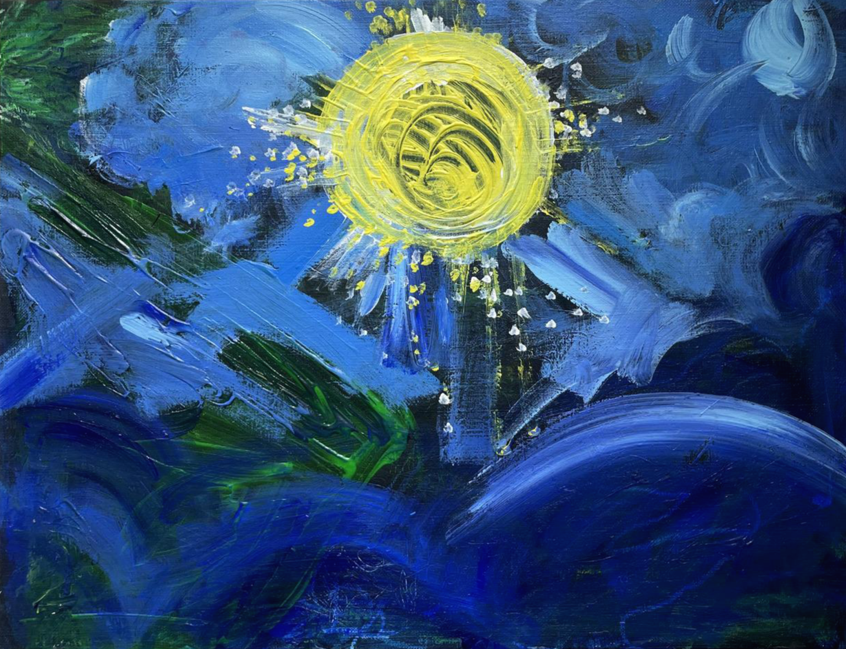 천 작가의 회화 중 <시작>은 나의 소장 욕구를 자극했다. 이 작품은 출발선에 있는 누군가의 시작을 응원하는 듯하다. 그림 앞에 서 있으면, 짙은 파란색과 선명한 노란색의 결합으로 생긴 에너지가 캔버스 밖으로 튀어 나올 것 같다. 내 눈에는 멀리서 바라보는 화산 폭발 장면 같기도 하고, 밤바다 위로 떠 오른 보름달 같기도 한데, 작가는 이 작품에서 천지 창조 같은 심오한 의미를 담았을 수도 있겠다.