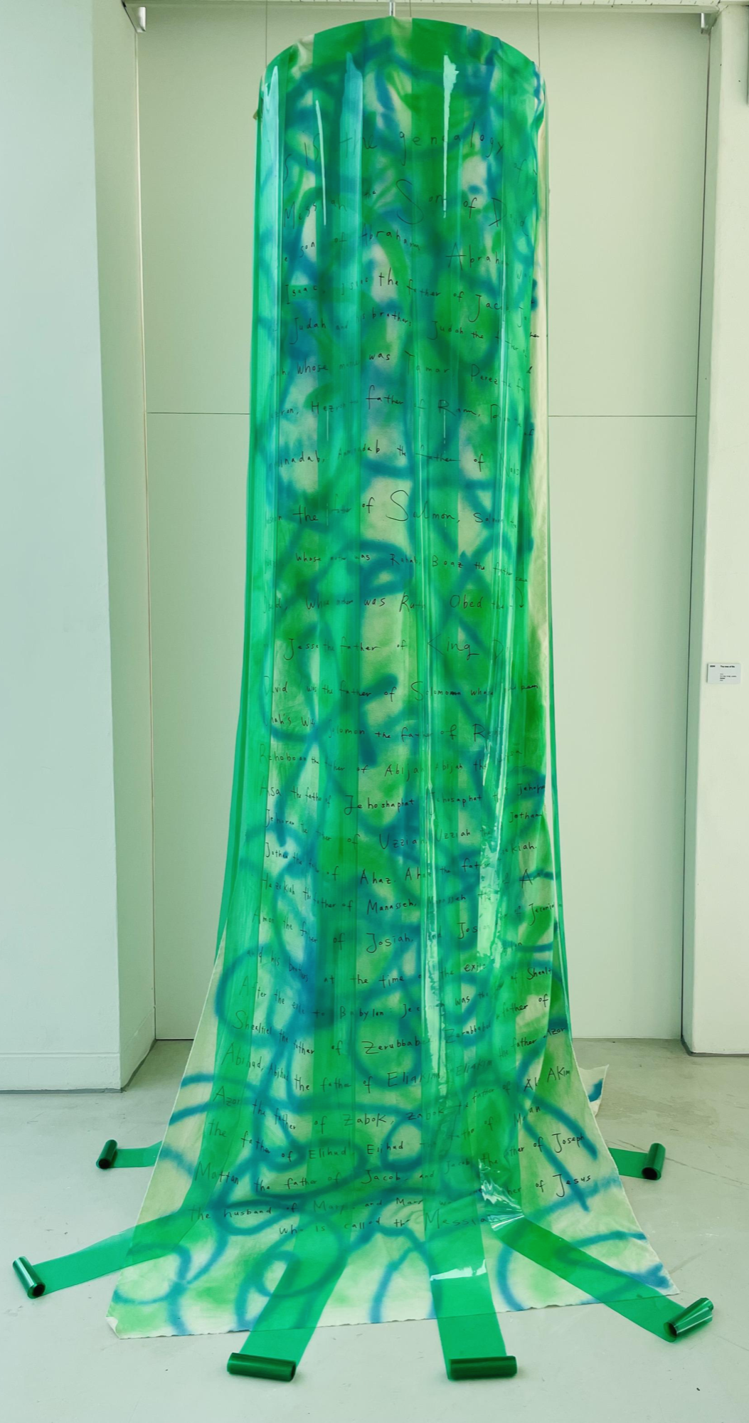 전시실 복도 끝 중앙에 있는 <The tree of life>는 성경과 족보에서 착안한 작품이다. 천 작가는 영혼의 양식이 곧 성경 말씀이고, 말씀이 곧 예수 그리스도라고 믿기에 마태복음 1장에 담긴 예수의 족보를 토대로 이 작품을 제작했다. 광목천에 작가가 직접 쓴 예수의 족보 위에 투명한 초록 필름을 내려뜨려 완성한 이 오브제는 나무의 뿌리를 형상화했다. 영어로 족보는 family tree인데, 작가는 이 작품을 통해 예수 그리스도의 족보는 곧 생명의 족보(The tree of life)임을 말하고자 했다.