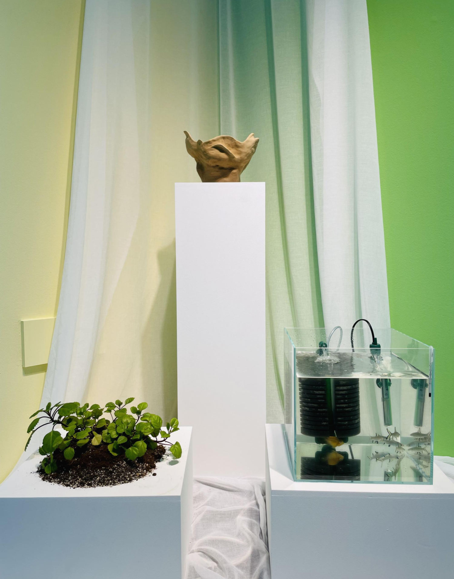 성경이 천 작가의 작품 세계에 영향을 주었음은 그녀의 설치 작업에서 찾아볼 수 있다. <인간의 형성>에서는 삼각형으로 높낮이가 다르게 배치한 도자, 식물, 수조가 하나의 오브제가 되어 관람객을 맞이한다. 성경은 하나님이 흙으로 사람을 지었다고 말한다. 작가는 이 구절을 읽으며 인간을 구성하는 최소한의 요건을 떠올렸다. 새싹에 생명력을 공급하는 흙과 물고기가 살 수 있는 물을 합하면 생명의 탄생에 충분한 조건이 될 수 있음을 깨닫고, 그녀는 흙과 물로 만드는 작품인 도자 그릇을 중앙에 배치하여, 인간의 형성을 완성했다.