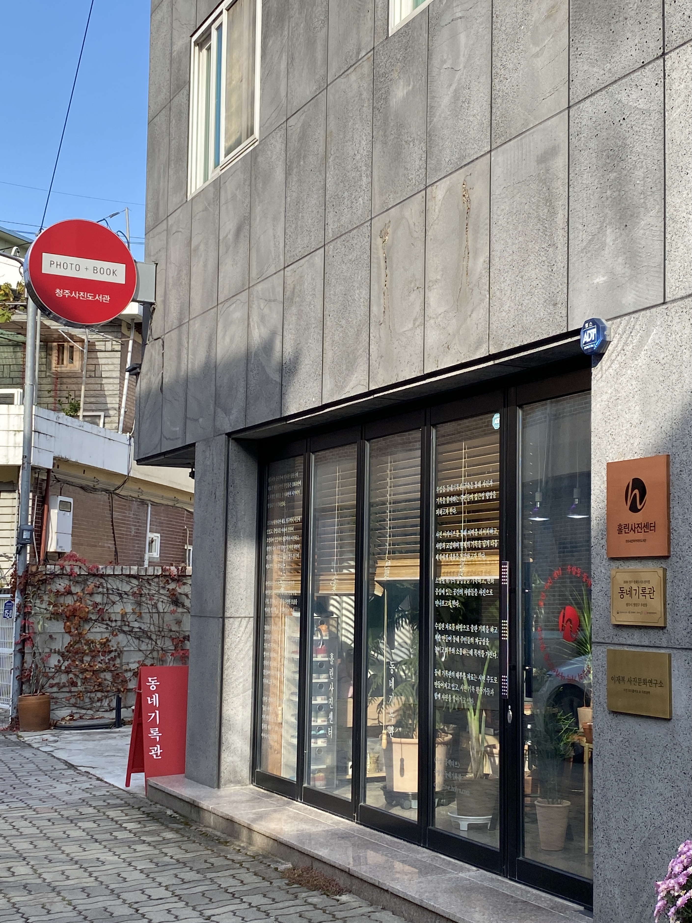 청주대학교 버스정류장에서 느리게 걸어도 3분 거리. 낮은 건물이 모여 만든, 차 한 대 지나다니기에 꼭 맞는 골목길을 따라 걷다 보면 목적지에 다다른다. 절임 배추 손질하며 두런두런 이야기 나누는 가족이 사는 집 앞, 빨간색 입간판이 눈에 들어온다. 우암동 동네기록관 ‘홀린사진센터’(이하 ‘홀린’)이자 ‘청주사진아카이브도서관’이다.