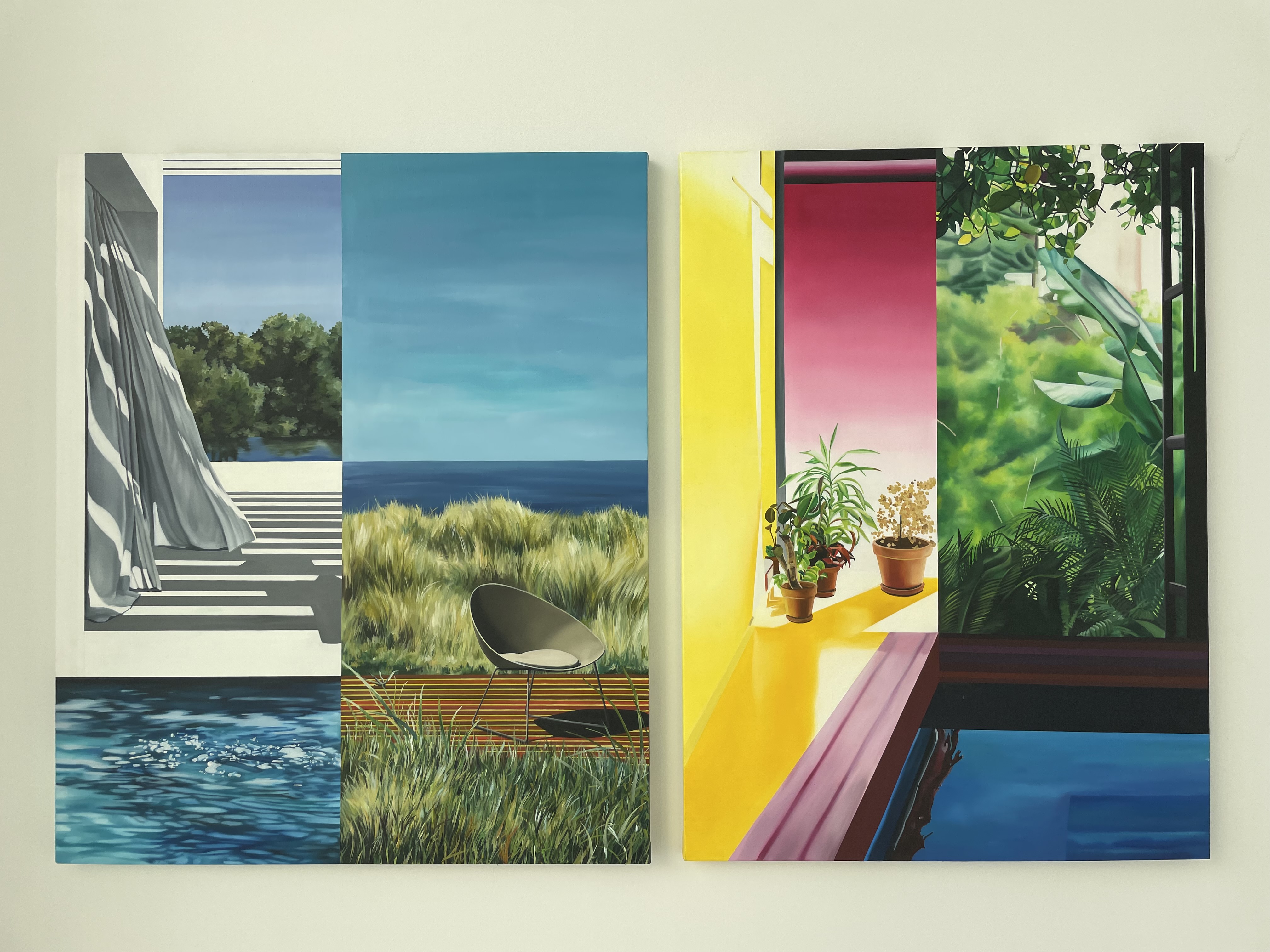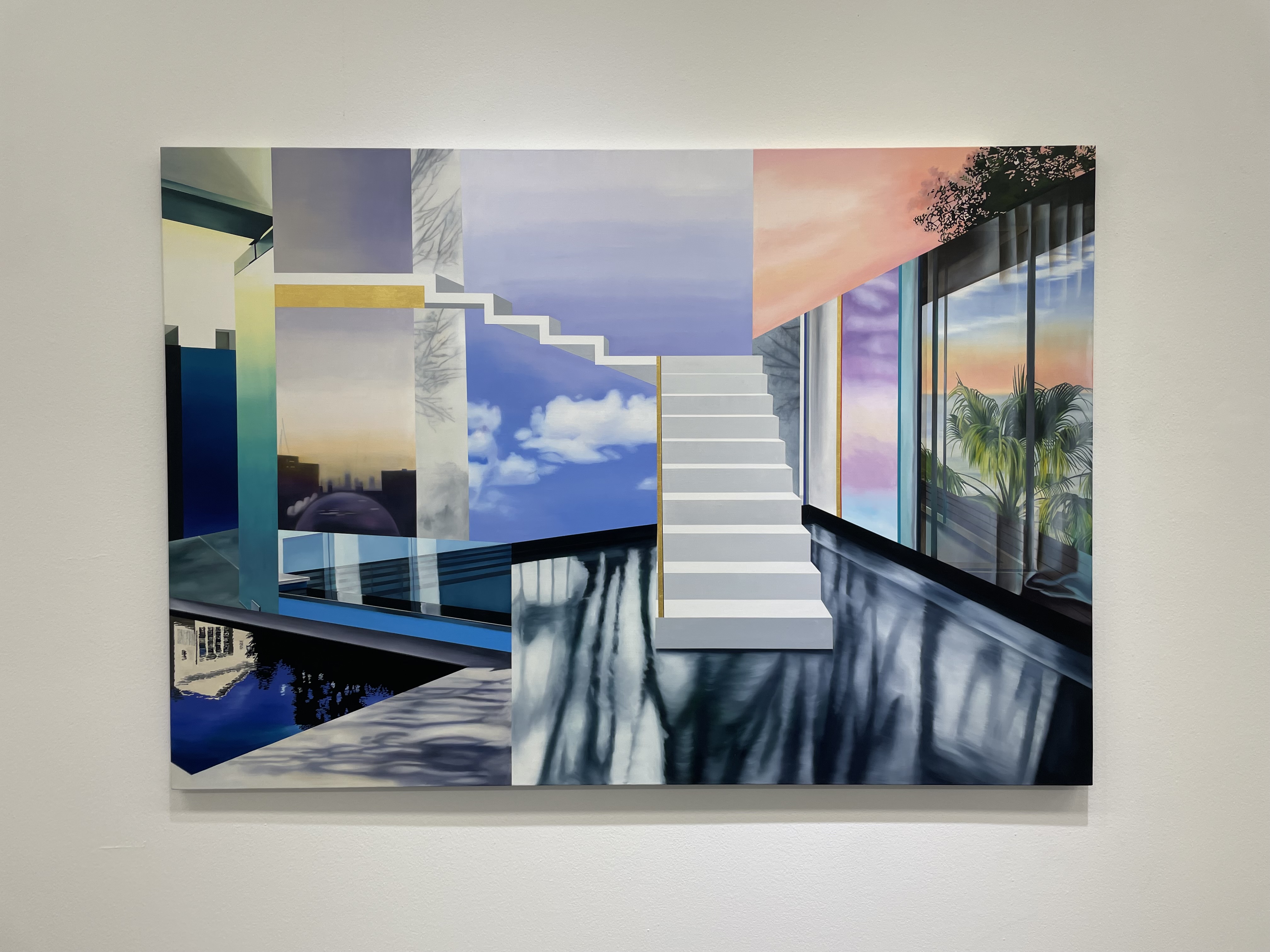 이번 전시회 이름은 《안과 밖의 경계 사이》이다. 김자혜는 정형화된 공간을 해석하고 이를 자신의 방식으로 해체하여 재구성한다. “여러 작품에서 나타나는 어디로 이어지는지 모를 계단은 문, 창문, 거울, 그림 등과 더불어 잠재적 이동을 약속할 따름이다.” (김자혜 작가 노트, 2021) 김 작가의 작품 속 공간이 실내인지 실외인지 구분하는 노력은 불필요하다. <The wind rises>에는 탁 트인 물가와 흰 커튼이 등장한다. 두 개로 나뉜 장면 속에 바람이 양쪽을 관통하며 천을 움직이고 풀을 일렁이게 한다. <The wind rises>와 나란히 있는 작품 <In and out>에는 식물원을 옮겨 놓은 듯한 푸르름과 석양을 조명 삼은 평범한 화분이 등장한다. 캔버스 하단에는 수영장인지 연못인지 알 수 없는 물이 있다. 전시실 긴 복도 정면에 걸린 작품을 보며 두 그림이 짝을 이루어 <In or out>이 되어도 좋겠다고 생각했다. 작품 앞에 선 관람객이 실내가 좋은지 실외가 좋은지 스스로 물어보면 재미있지 않을까? 나의 선택은 무엇일지 고민하다 이 전시회 제목이 《안과 밖의 경계 사이》임을 기억해 냈다. 어쩌면 김자혜 작가는 이 전시를 통해 특정한 현상과 환경을 두고 딱 부러지는 경계를 짓지 말라고 제안하고 있는지도 모른다. 김 작가의 작품은 여러 장면을 섞어 놓은 콜라주 방식을 사용하기에 화면 구성이 복잡하지만, 오래 바라보면 오히려 차분함이 밀려온다. 작품 속에 존재하는 비현실적인 공간은 역설적으로 종착지 또는 목적지 같은 완결성을 연상시켰다.