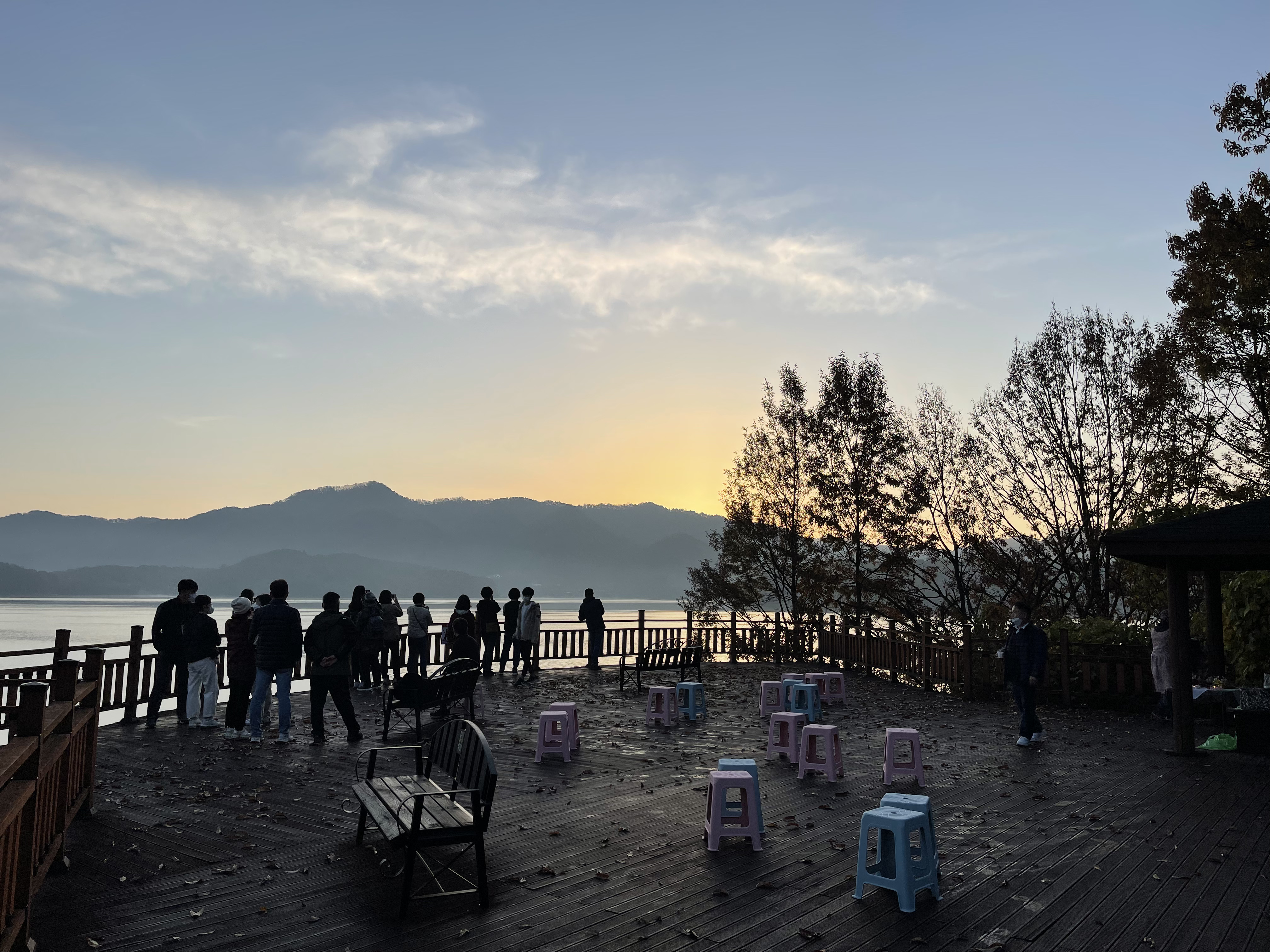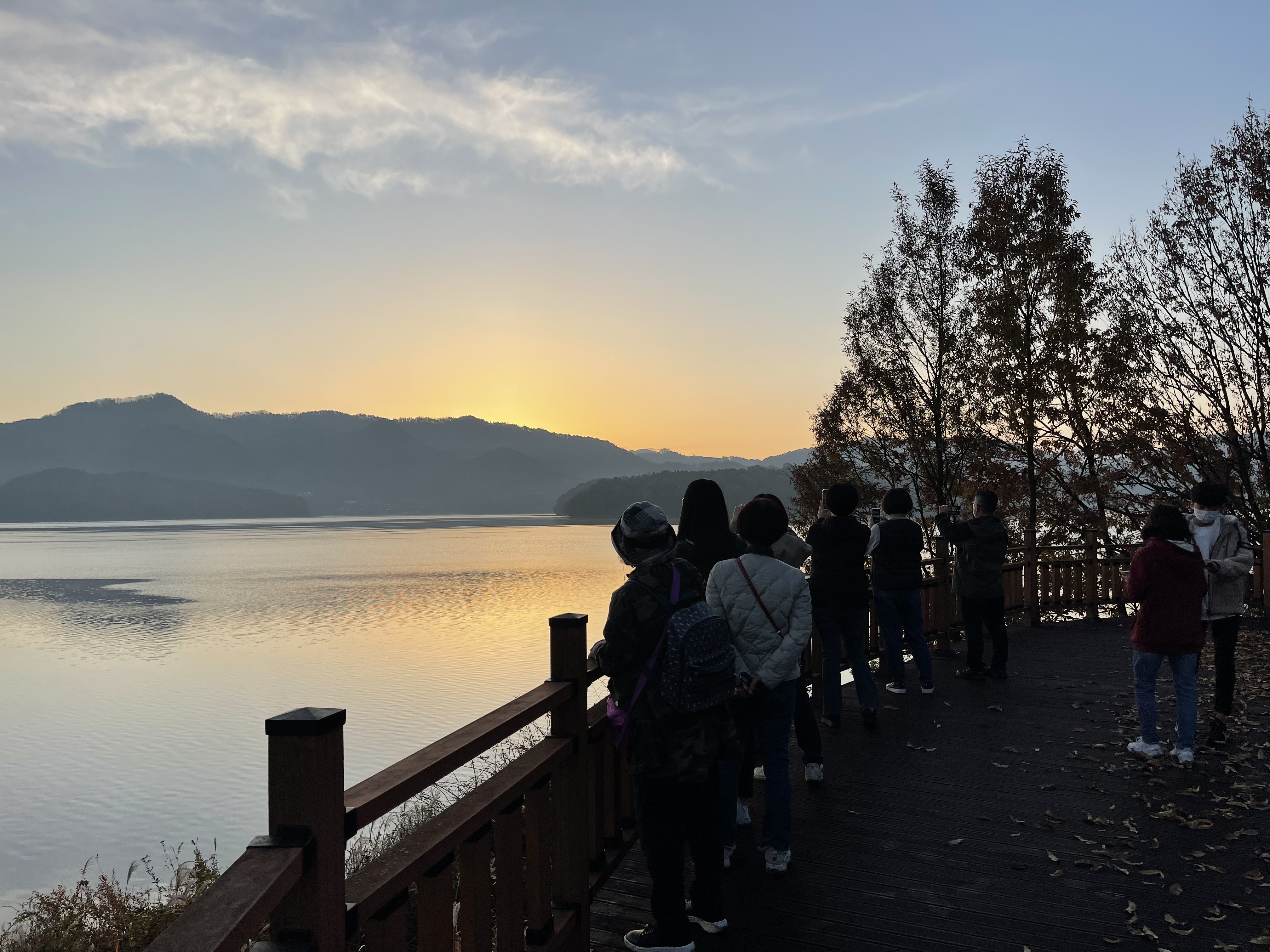 황새바위 전망대에 도착하니 따뜻한 차와 예쁘게 담은 견과류, 과일과 떡을 준비해 놓은 진행팀이 참가자를 맞이한다. 다양한 빛깔을 내는 차를 한 잔씩 받아 간이 의자에 앉아 해를 기다렸다. 그곳에서 대청호에 관한 이야기도 나누고 물 밑에 가라앉은 마을과 삶을 이야기했다.