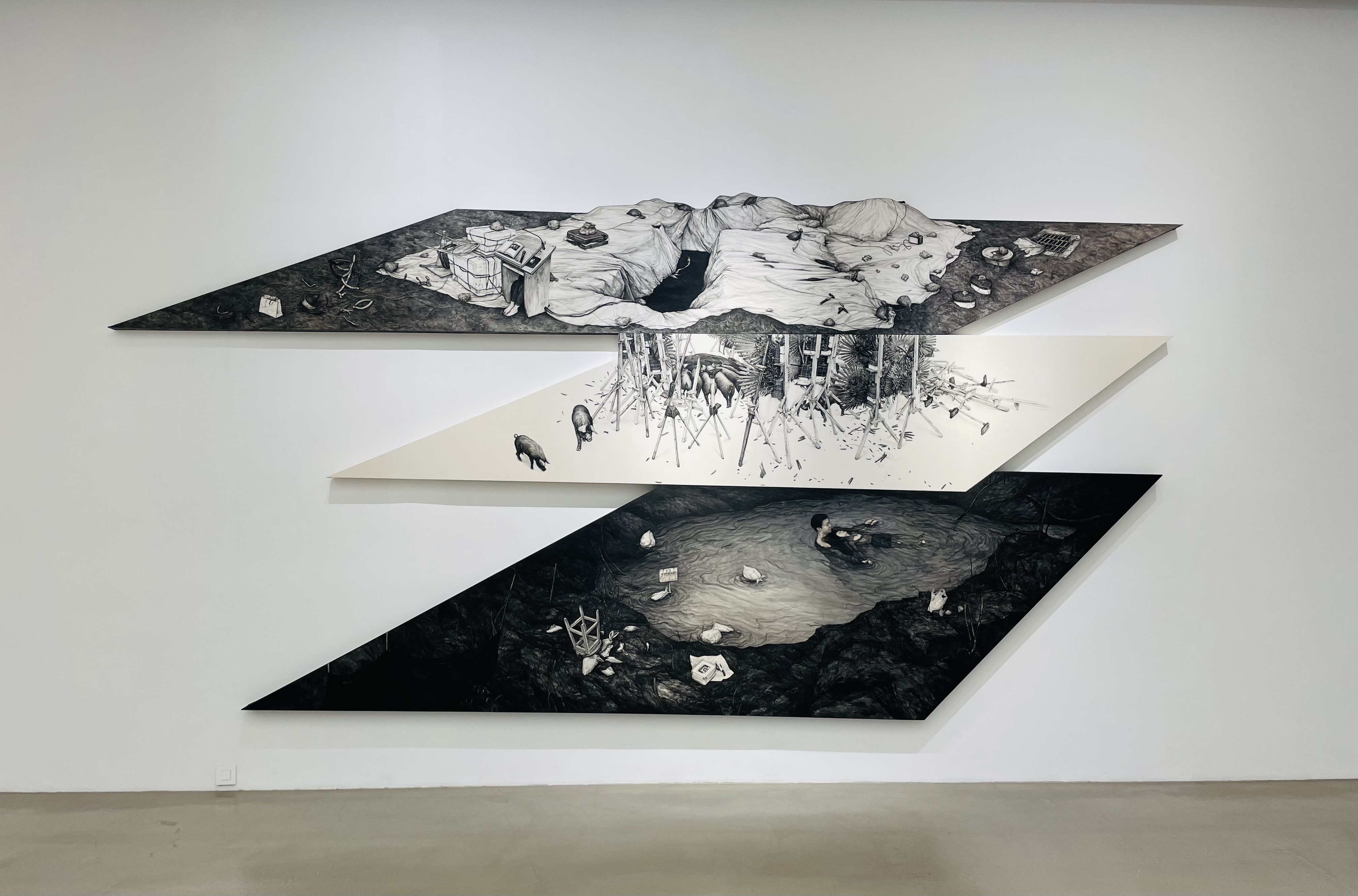 〈가짜 우물〉은 폭이 5m가 넘는 대형작으로 3층으로 쌓은 비정형 캔버스를 사용한다. 제일 높은 층은 방치된 공사장이다. 관 하나 들어갈 크기의 구멍은 방수포로 덮여 있다. 군데군데 눌러놓은 모래주머니와 흩어진 전선이 스산함을 더한다. 화폭 상단 구석의 배수로 덮개는 밑으로 내려가 는 입구다. 하지만 내려가도 안전지대가 아니다. 마름모꼴로 재단된 캔버스 모서리의 아래층은 지지대가 없이 허공에 떨어지는 구조다. 얼떨떨한 상황을 벗어나 주위를 돌아보면 가운데층을 가득 채운 장례식 화환을 만난다. 철저하게 앞면만 사용하는 화환은 꽃이 뽑히고 구조가 분해 된 채. 서 있다. 화환 사이로 떼를 지어 등장해 역동성을 주는 돼지는 전체적으로 쓸쓸한 장면 속에서 관객을 웃프게 만든다. 단상 밑에 웅크린 사람, 물고기가 살지 못할 환경에서 쓰레기와 함께 헤엄치는 어른과 아이, 쭈글쭈글한 물 웅덩이의 낚시 금지 팻말까지 현대 사회의 아이러니와 상처를 냉정할 만큼 세밀하게 기록했다.〈가짜 우물〉을 직사각형의 캔버스에 가두었다면 관객들은 지금처럼 강렬한 시각적 효과와 다층적인 감정을 경험하지 못했을 것이다.