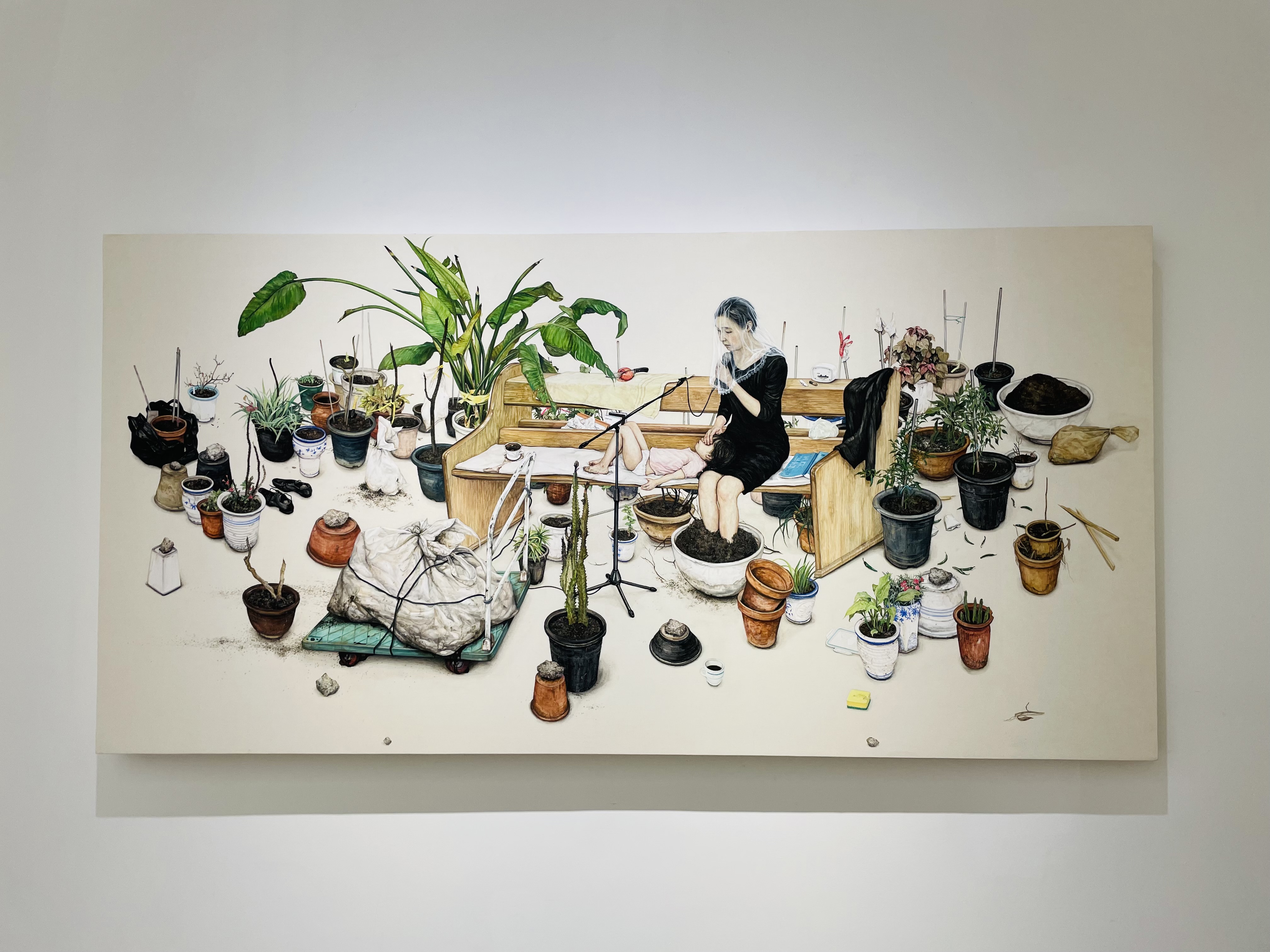 이진주 작가의 그림을 관람한 첫 소감은 슬픔과 아름다움의 공존이었다. 〈오목한 노래〉에는 사람들이 두고 간 화분 수십 개가 등장한다. 하나같이 볼품없다. 손길을 놓쳐 조형미를 잃은 화분, 지지대만 남은 화분, 큰 화분 위에 포개진 작은 화분, 뒤집어서 돌을 괸 화분이 화면 곳곳을 채운다. 가운데에는 장의자에 앉은 여인과 누워 있는 아이가 있다. 여자는 왼손으로 마이크를 들고 오른손으로 아이의 눈을 가렸다. 어른의 다리를 베개 삼아 잠을 청하는 아이에게 자장가를 들려주는 걸까? 미사보를 쓰고 눈과 입을 다문 모습을 보니 기도 중일 수도 있겠다. 마이크 스탠드의 전 선을 따라 시선을 옮기면 낡은 손수레를 만난다. 그 위에는 힘없이 푹 가라앉은 포대와 밑으로 새는 끈적한 액체가 있다. 배터리가 다 되어 빼놓은 탁상시계, 손가락을 쳐든 장갑, 널브러진 뚜껑과 청소용 수세미가 무심히 관람객을 바라본다. 철거촌의 골목처럼 스산하지만, 생명이 멈춘 것은 아니다. 얼마 전까지 고추가 열렸고 지금도 하얀 꽃이 피어 있다. 화분이 되어 버린 사람, 버려진 화초, 들리지 않는 노래를 배경으로 천천히 흐르는 시간은〈오목한 노래〉가 회화가 아니라 영상작품 같다는 착각마저 일으켰다.