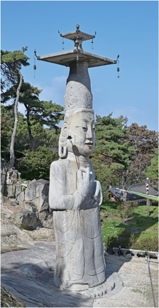 논산 관촉사 석조미륵보살입상은 국보다. 보물이었다가 2018년 다시 국보로 승격했다. 고려 시대 불상으로 전체 높이 18.12m다. 우리나라에서 가 장 크다. 옛 은진현에 조성해서 흔히 ‘은진미륵’이라고 부른다. 이 불상을 처음 본 사람은 으레 ‘헉’했다가 슬며 시 미소를 짓는다. 엄청난 크기에 압도당했다가 모든 안정적인 비율을 무시한 형태에 피식 웃음이 난다. 7등신은 고사하고 4등신 정도의 비율도 우스꽝스럽고 가슴팍에 모은 손도 과하게 크다.