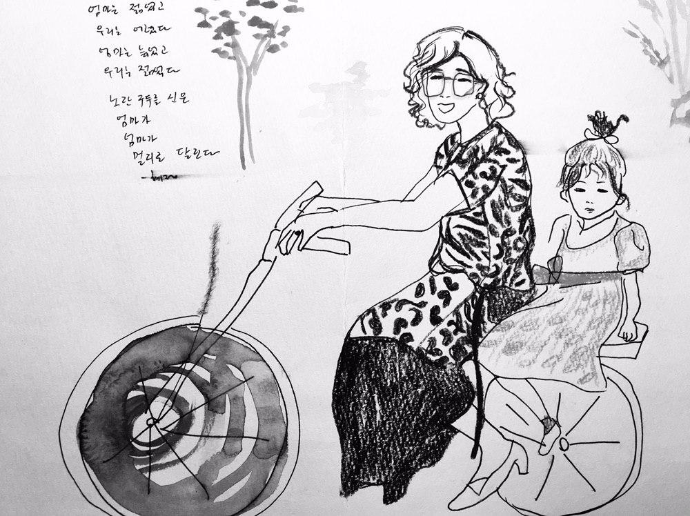 얼마 전 드로잉 수업 시간에 젊은 엄마와 어릴 적 내가 자전거를 타고 찍은 사진을 가져가서 그림으로 그렸다. 사진 속 엄마는 30대 초반, 나는 대여섯 살 되었을까. 노란 구두를 신은 엄마가 활달하고 신나 보인다. 힙하다. 옷차림도 끼고 있는 안경도. 지금의 나보다 훨씬 어린 나이에 나와 오빠를 낳고 우리를 키웠을 엄마의 젊은 시절은 어땠을까.