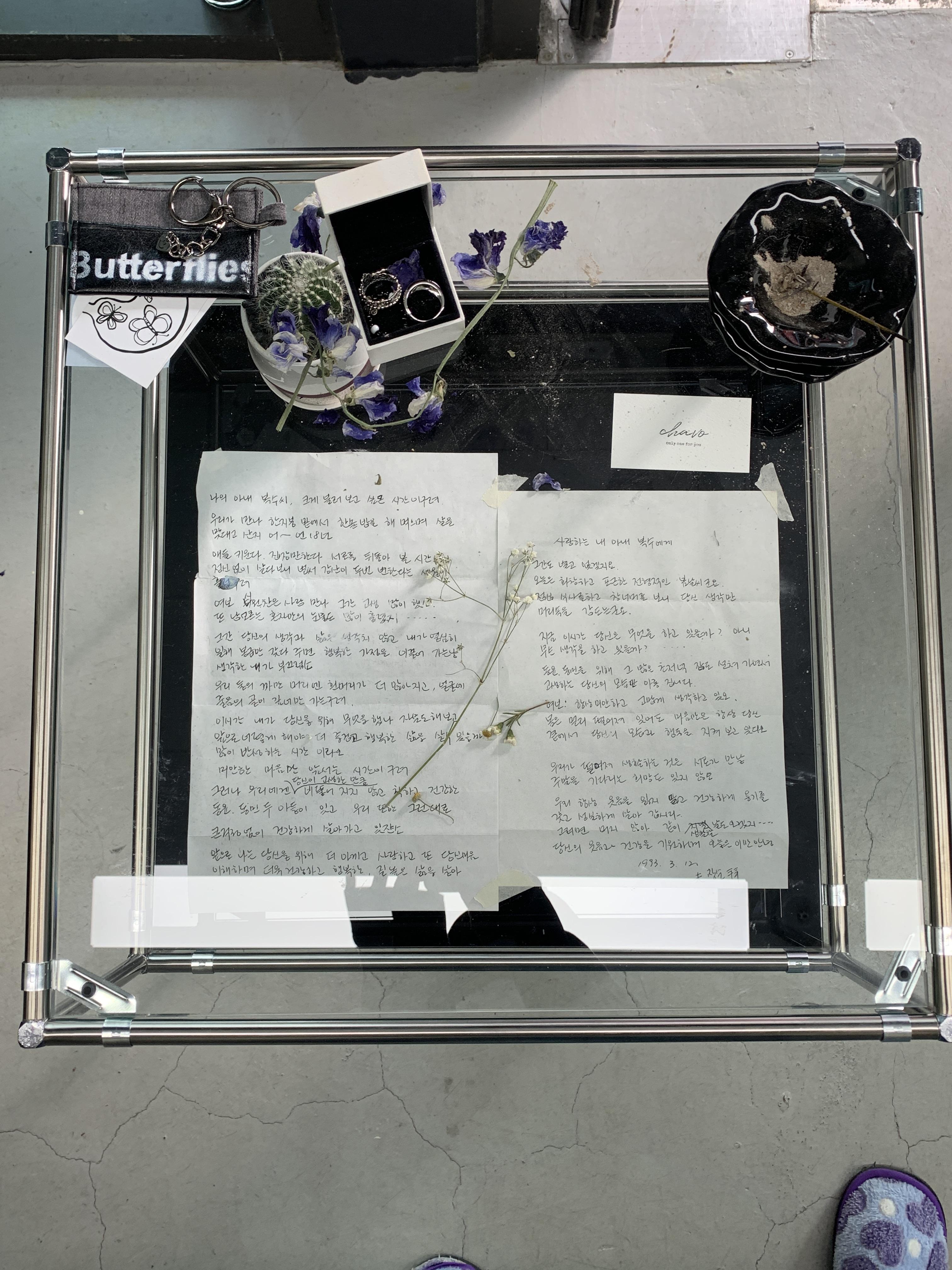 그래서일까 챠보에 걸린 옷들에서는 김가은 대표의 취향이 고스란히 전해졌다. 독특하면서도 무난하고, 입는 사람이 편한 옷. 평범해 보이지만 개성이 뚜렷한 옷에 나도 모르게 눈길이 갔다. 또 하나 시선을 끄는 게 있는데, 매장 한가운데 위치한 자개 장식장이다. 빈티지한 느낌을 살리기 위해 다 쓴 걸 구해왔는데, 마침 서랍 안에 전 주인이 아내에게 쓴 편지가 있었더랬다. 편지는 장식장 옆 투명 테이블 안에 고이 모셔뒀다.