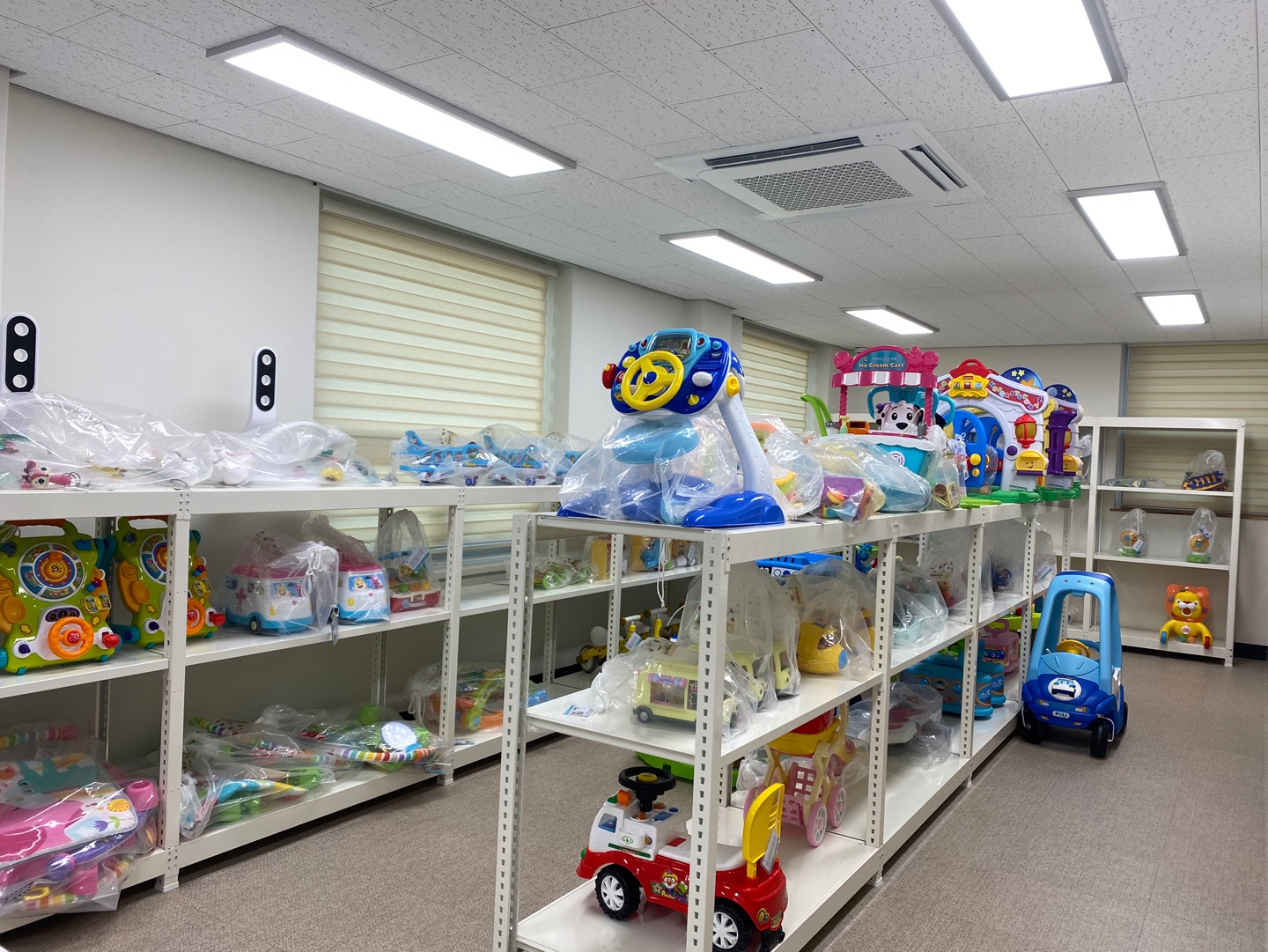 계단을 따라 올라간 2층에는 장난감 공유센터가 있다. 장난감 값이 금값이라 어린이날에는 허리가 휜다는 말이 있다. 이제 그 비싼 값을 부담하지 않고도 다양한 종류의 장난감을 대여해 볼 수 있다. 이곳에서는 회원가입 후 연회비를 내면 1년간 자유롭게 장난감 대여가 가능하다. 장난감 종류도 가지각색이다. 영유아용부터 놀이학습용까지 연령대에 맞는 장난감이 가지런히 진열되어 있다. 요즘 비대면 추세라서 가정교육을 주로 하기 때문에 방문자는 놀이학습용 장난감을 많이 빌려 간다. 그래서인지 사랑애(愛)에서는 장난감 공유센터가 가장 이용률이 높다. 반납한 장난감은 세척 후 자외선 소독기로 충분한 살균을 한다.