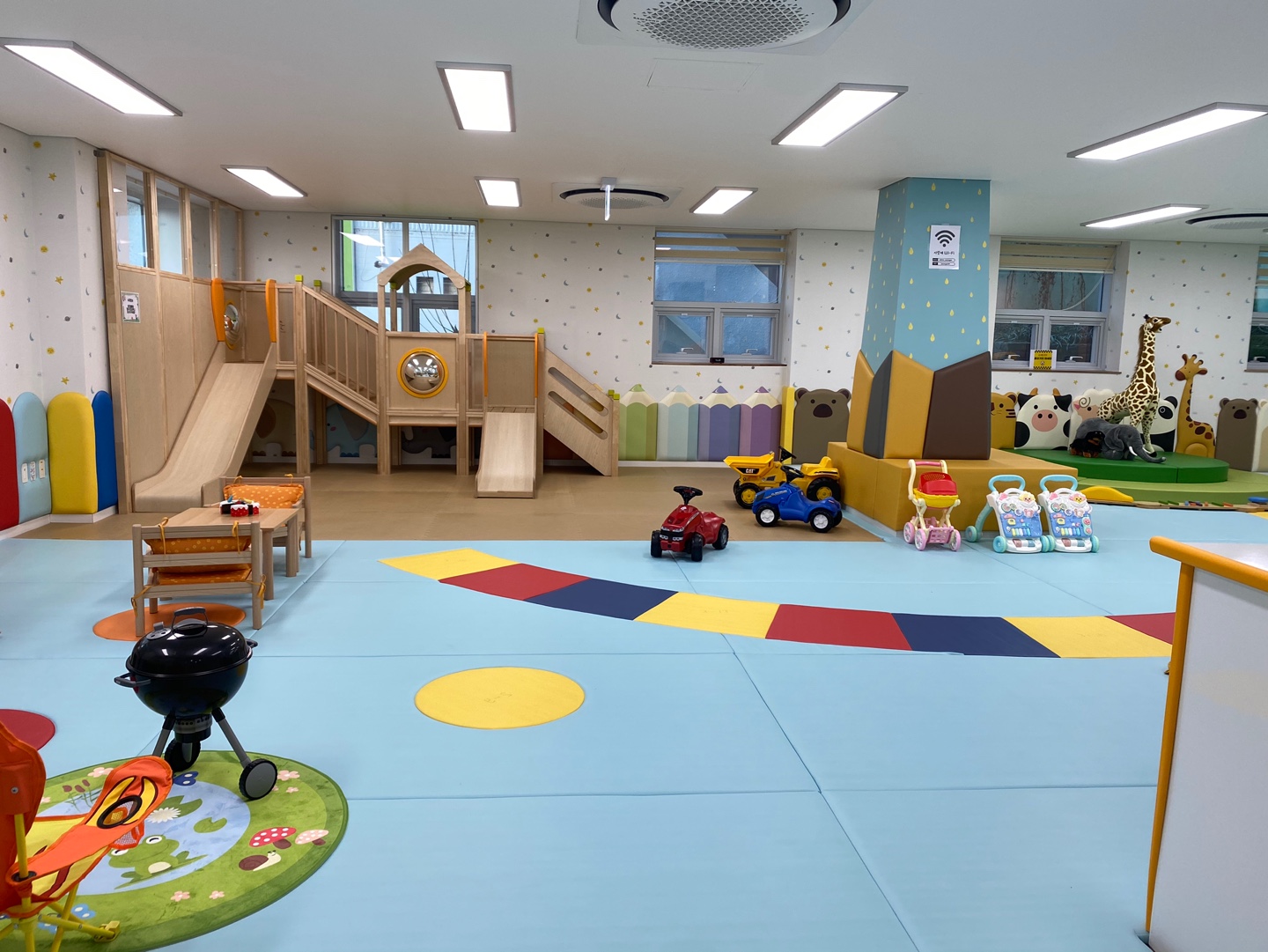 골목 안쪽 복수동을 배경으로 한 벽화를 보며 걷다 보면 사랑애 건물 입구에 다다른다. 1층 현관문을 열고 들어가는 순간 신난 아이들 소리와 동요가 동시에 들려왔다. 1층은 맘센터로, 아이들 실내 놀이공간과 수유실이 있다. 놀이공간은 오전 2시간, 오후 2시간씩 개방한다. 내부모습은 약간의 키즈카페를 연상케 했는데 굉장히 저렴한 가격에 공간을 이용할 수 있다.