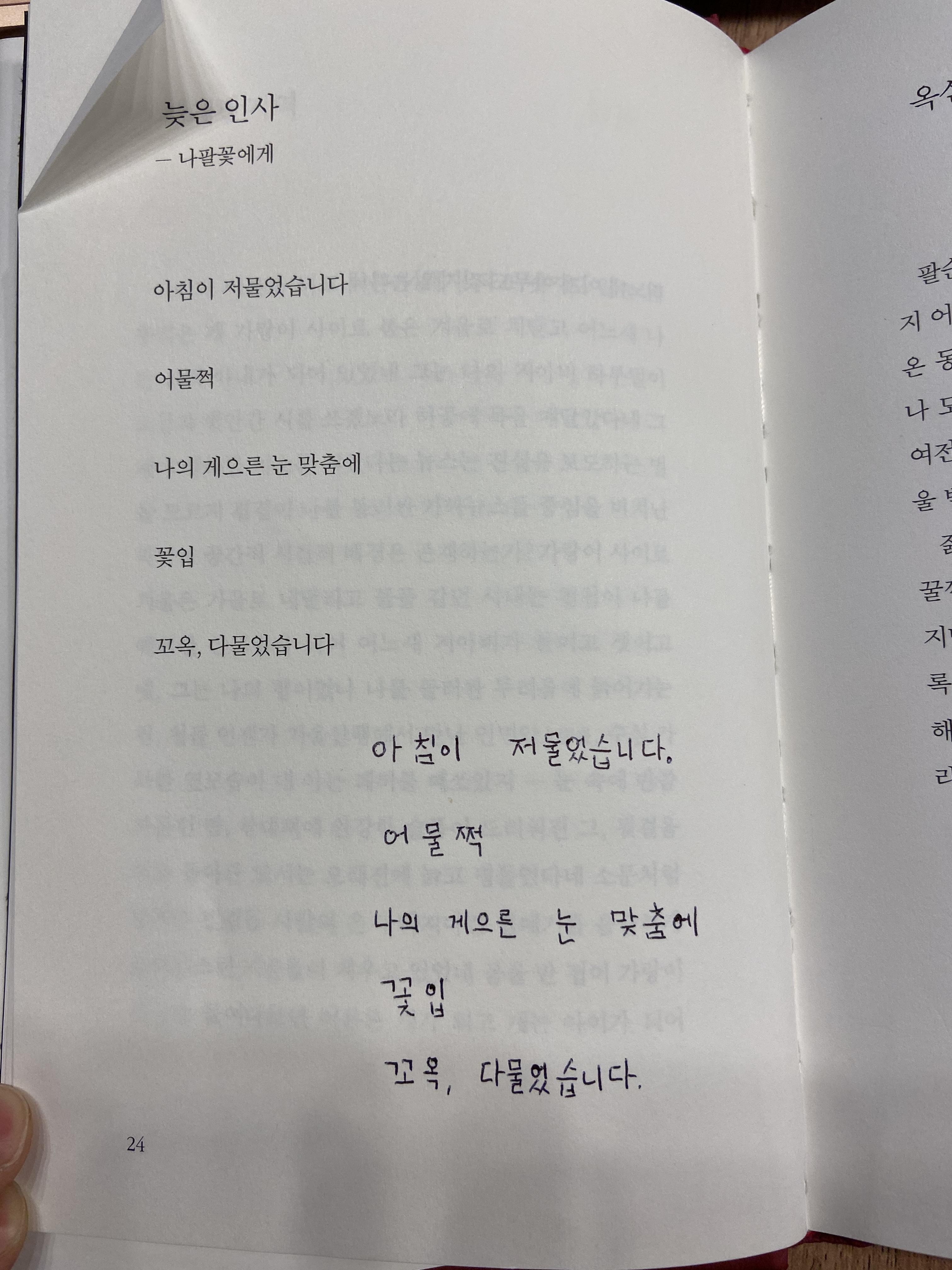 공심채 볶음은 베트남에서 배웠다. 그들은 모닝글로리라고 했다. 베트남을 다녀와서도 한동안 공심채 볶음을 해 먹었다. 26살때 일이다. 지금도 공심채 볶음을 해 먹을 때면 나는 베트남을 생각한다. 엄마와 처음 간 해외여행이었다. 엄마는 나팔꽃을 키웠다. 엄마는 아파트 작은 베란다에 나팔꽃을 키웠다. 내가 아직 유치원에 들어가기 전이었을 거다. 엄마는 아마 나에게 꽃을 보여주고 싶었나 보다. 잊고 있던 기억인데 시를 읽다 문득 선명히 그날 기억이 떠올랐다. 시는 다섯 줄밖에 안 됐다. ‘아침이 저물었습니다’로 시작하는 이 시의 부제는 ‘나팔꽃에게’다. 시가 마음에 들어 나팔꽃에 대해 찾아보다 나팔꽃이 영어로 모닝글로리란 걸, 공심채와 나팔꽃이 학명이 비슷하단 걸 알게 되면서 어릴 적 잊고 있던 기억이 떠올랐다. 나팔꽃이란 단어는 어릴 때 알았지만 그 뜻은 29년이 지나 이제야 좀 더 선명해졌다. 시집을 읽으며 인터뷰를 준비하다 마음이 먹먹해졌다.