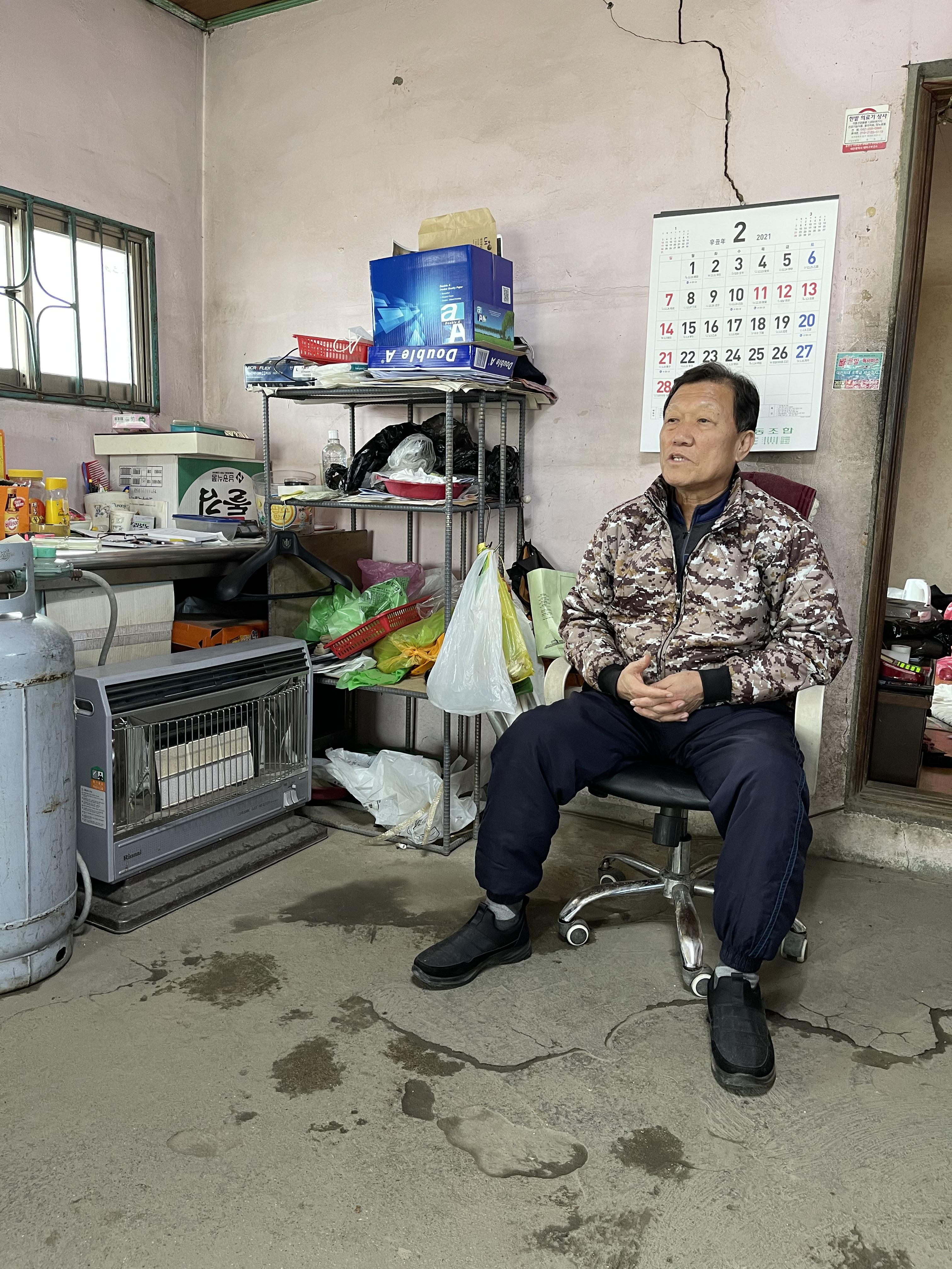 구마니 마을에 다른 건물과 달리 신흥슈퍼는 부서진 곳 없이 제법 온전하게 남았다. 그래도 더는 소소한 생활용품이나 음식을 팔 것처럼 보이지는 않았다. 넓게 유리를 끼운 미닫이문 앞에 서서 안을 기웃거렸다. 밖처럼 안도 깔끔했다. 다음에 들어올 사람을 위해 전 주인이 깨끗하게 정리해주고 나간 것처럼 말이다. 혹시나 하는 마음에 힘을 주어 미닫이문을 열어보니, 스르르 열린다. 안에 갇혔던 미적지근한 공기가 훅 몰려나온다. 공간 중심부에 있는 연탄난로가 내뿜는 열기였다. 그곳에서 김덕근 씨를 만났다. 밖에서 안을 들여다보면 보이지 않는 사각지대에 앉아 있었다. 김덕근 씨는 멀뚱히 앉아 낯선 방문객을 대수롭지 않은 눈길로 쳐다보았다. 지금껏 마을이 겪은 수많은 변화에 비하면 모르는 사람 하나 마을에 들어와 돌아다니는 건 별일도 아닐 거다.
